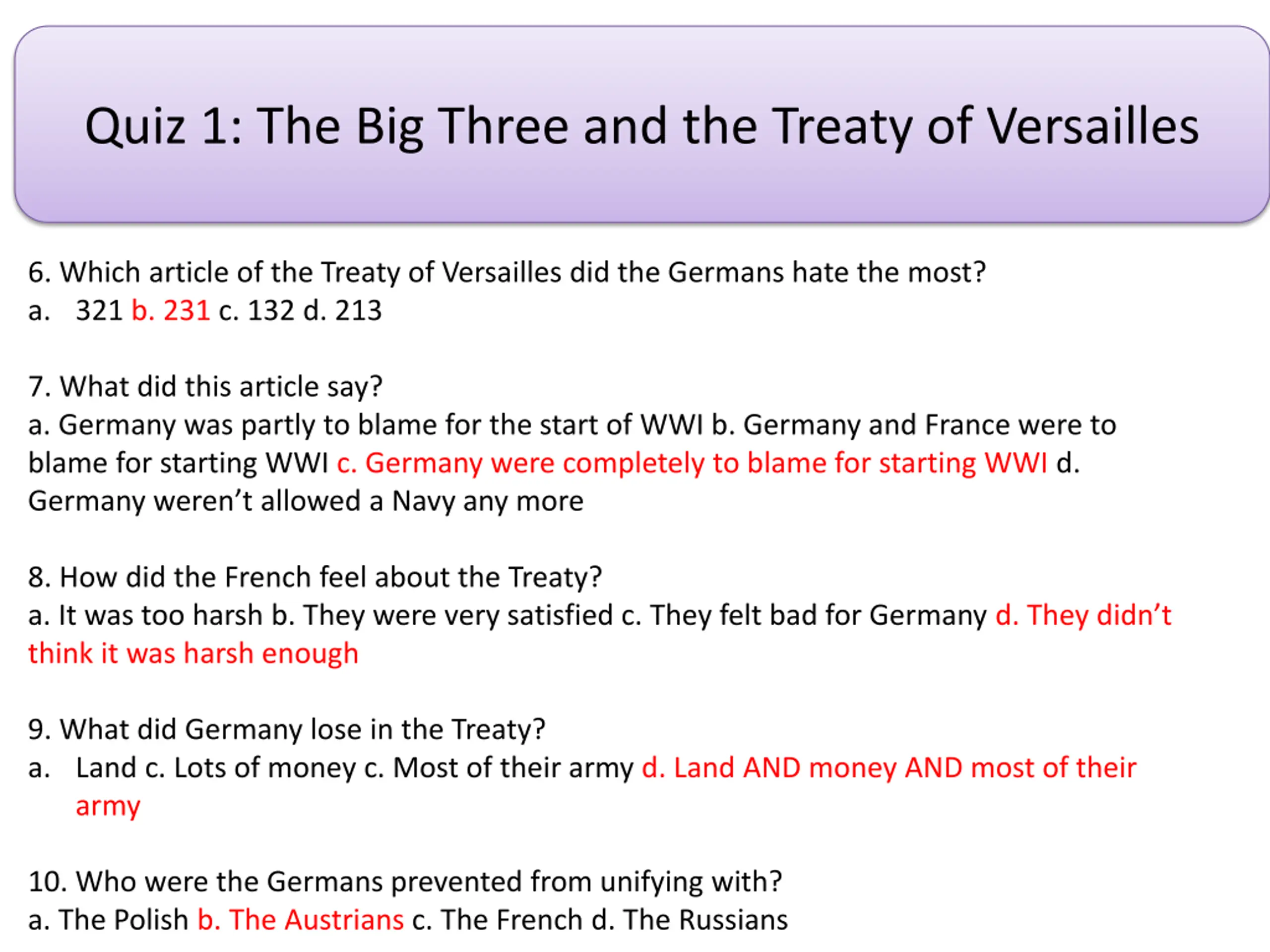 Quiz 1: The Big Three and the Treaty of Versailles 6. Which article of the Treaty of Versailles did the Germans hate the most? a. 321 b. 231 c. 132 d. 213 7. What did this article say? a. Germany was partly to blame for the start of WWI b. Germany and France were to blame for starting WWI c. Germany were completely to blame for starting WWI d. Germany weren t allowed a Navy any more 8. How did the French feel about the Treaty? a. It was too harsh b. They were very satisfied c. They felt bad for Germany d. They didn t think it was harsh enough 9. What did Germany lose in the Treaty? a. Land c. Lots of money c. Most of their army d. Land AND money AND most of their army 10. Who were the Germans prevented from unifying with? a. The Polish b. The Austrians c. The French d. The Russians