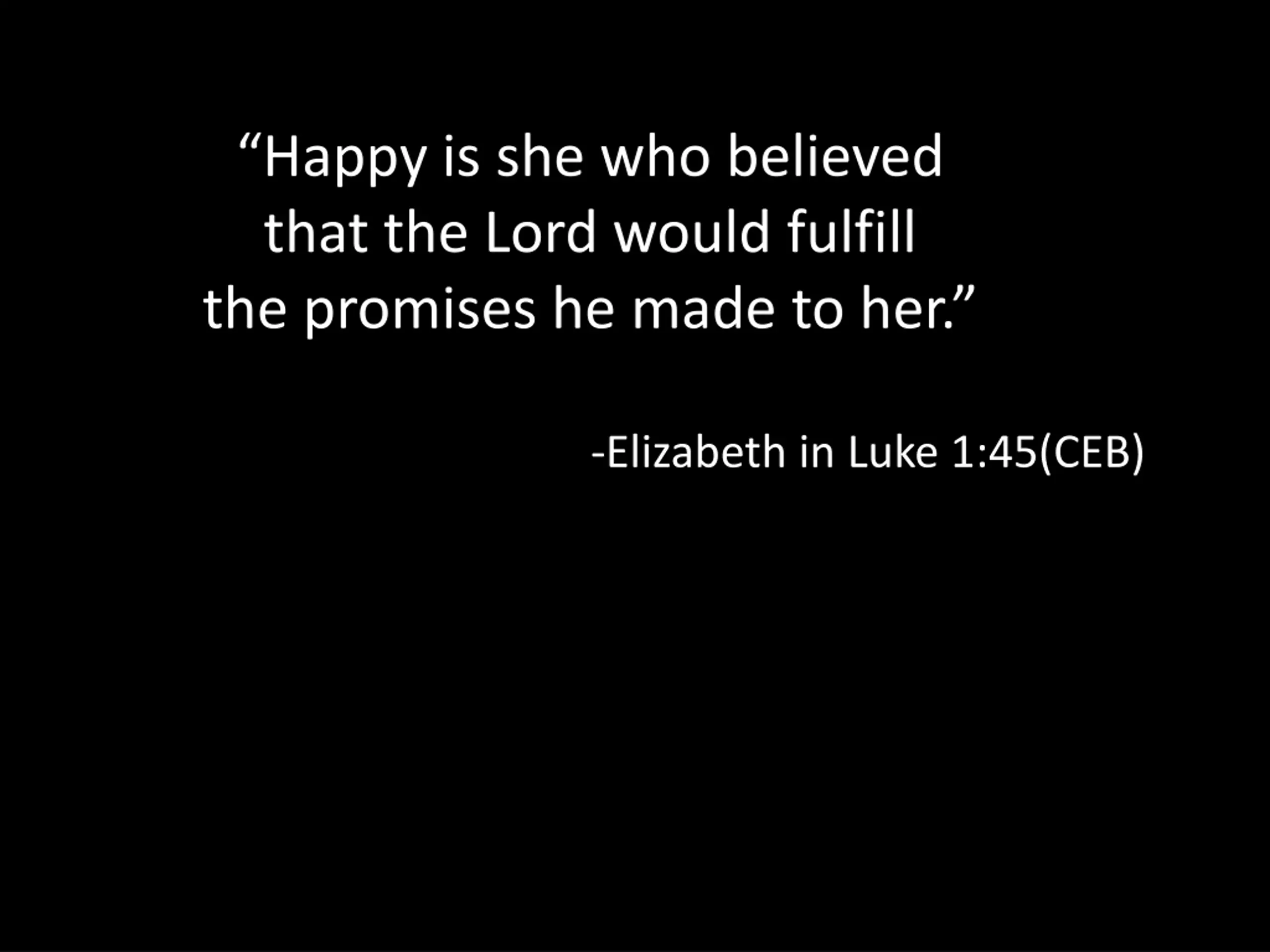 Happy is she who believed that the Lord would fulfill the promises he made to her. -Elizabeth in Luke 1:45(CEB)