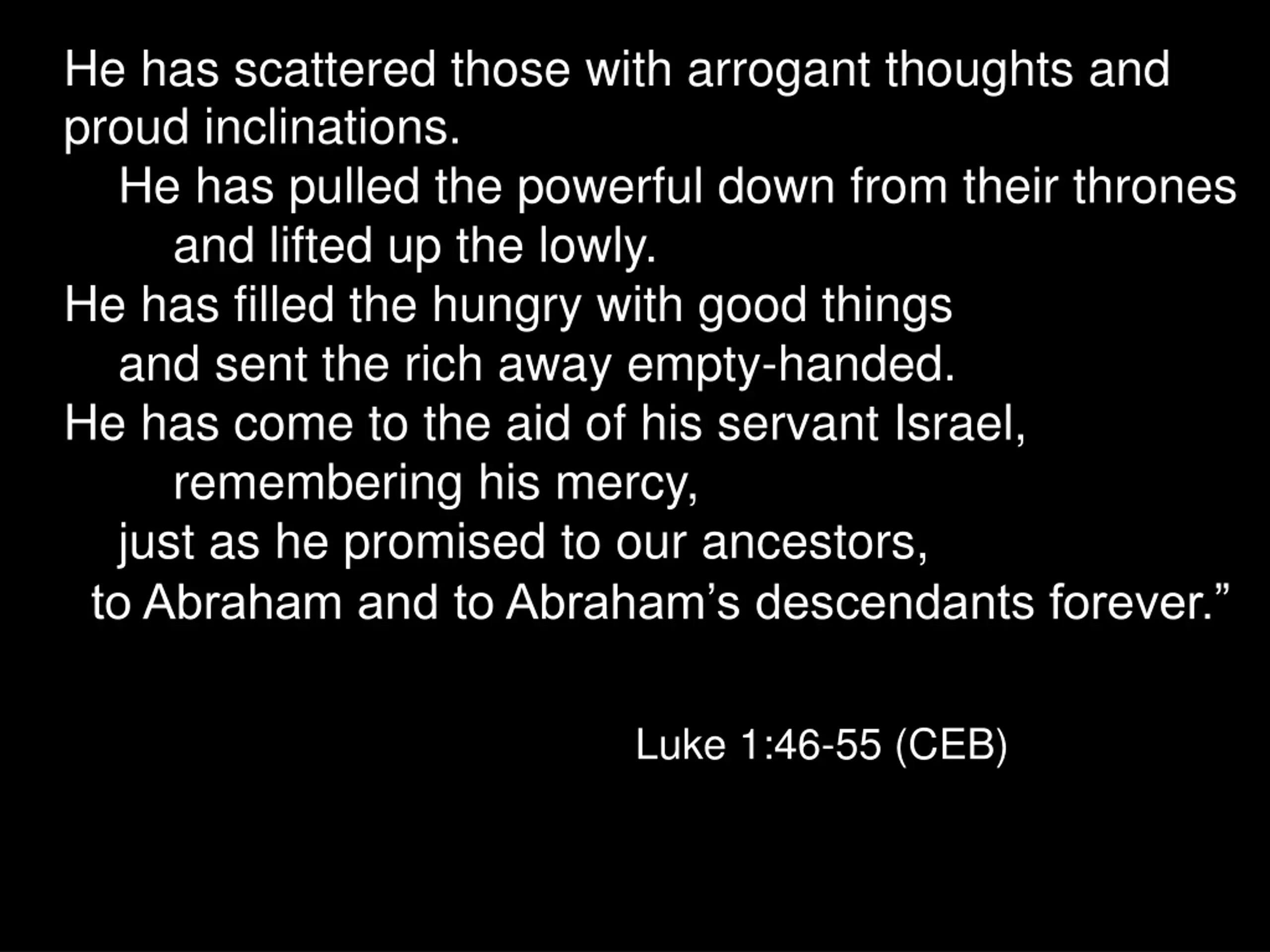 He has scattered those with arrogant thoughts and proud inclinations. He has pulled the powerful down from their thrones and lifted up the lowly. He has filled the hungry with good things and sent the rich away empty-handed. He has come to the aid of his servant Israel, remembering his mercy, just as he promised to our ancestors, to Abraham and to Abraham s descendants forever. Luke 1:46-55 (CEB)