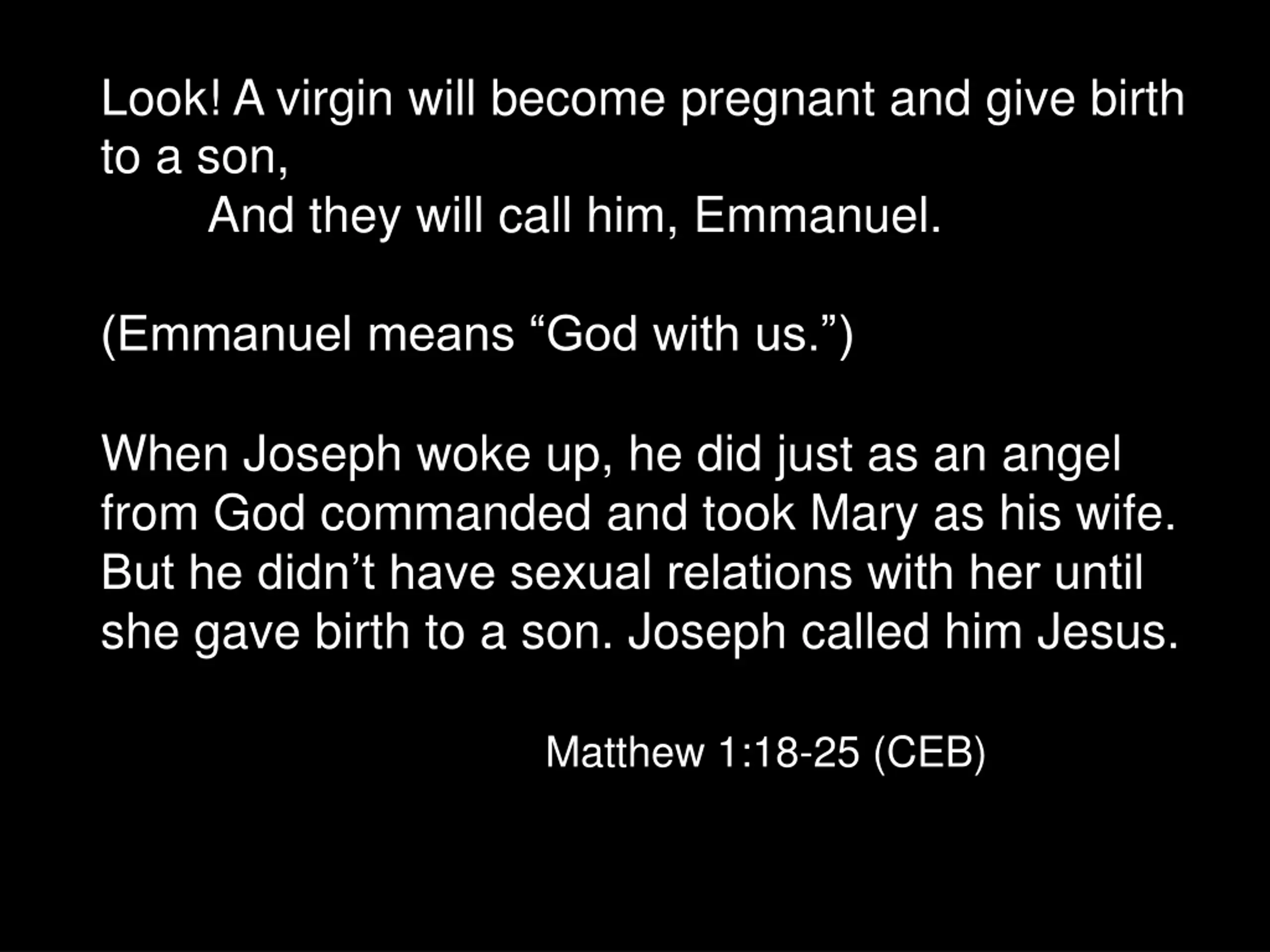 Look! A virgin will become pregnant and give birth to a son, And they will call him, Emmanuel. (Emmanuel means God with us. ) When Joseph woke up, he did just as an angel from God commanded and took Mary as his wife. But he didn t have sexual relations with her until she gave birth to a son. Joseph called him Jesus. Matthew 1:18-25 (CEB)