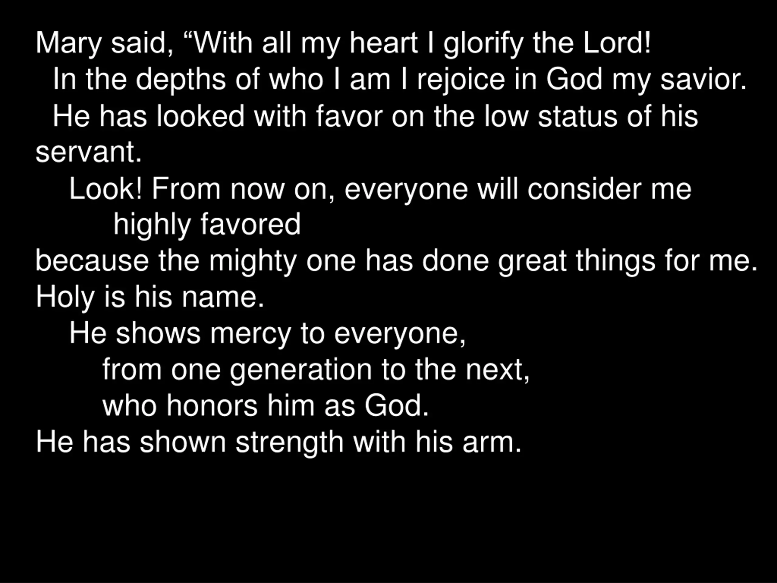 Mary said, With all my heart I glorify the Lord! In the depths of who I am I rejoice in God my savior. He has looked with favor on the low status of his servant. Look! From now on, everyone will consider me highly favored because the mighty one has done great things for me. Holy is his name. He shows mercy to everyone, from one generation to the next, who honors him as God. He has shown strength with his arm.