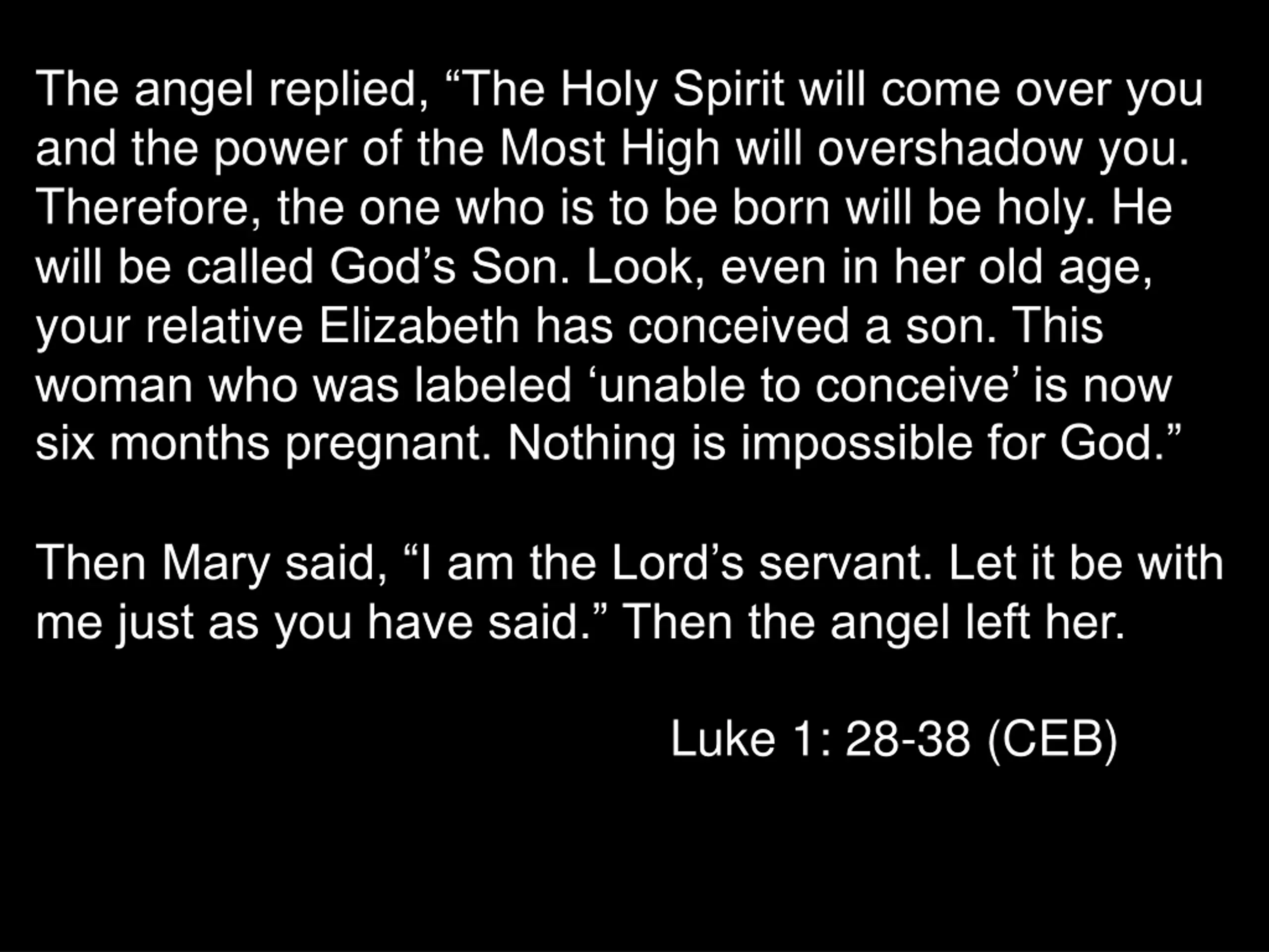 The angel replied, The Holy Spirit will come over you and the power of the Most High will overshadow you. Therefore, the one who is to be born will be holy. He will be called God s Son. Look, even in her old age, your relative Elizabeth has conceived a son. This woman who was labeled unable to conceive is now six months pregnant. Nothing is impossible for God. Then Mary said, I am the Lord s servant. Let it be with me just as you have said. Then the angel left her. Luke 1: 28-38 (CEB)