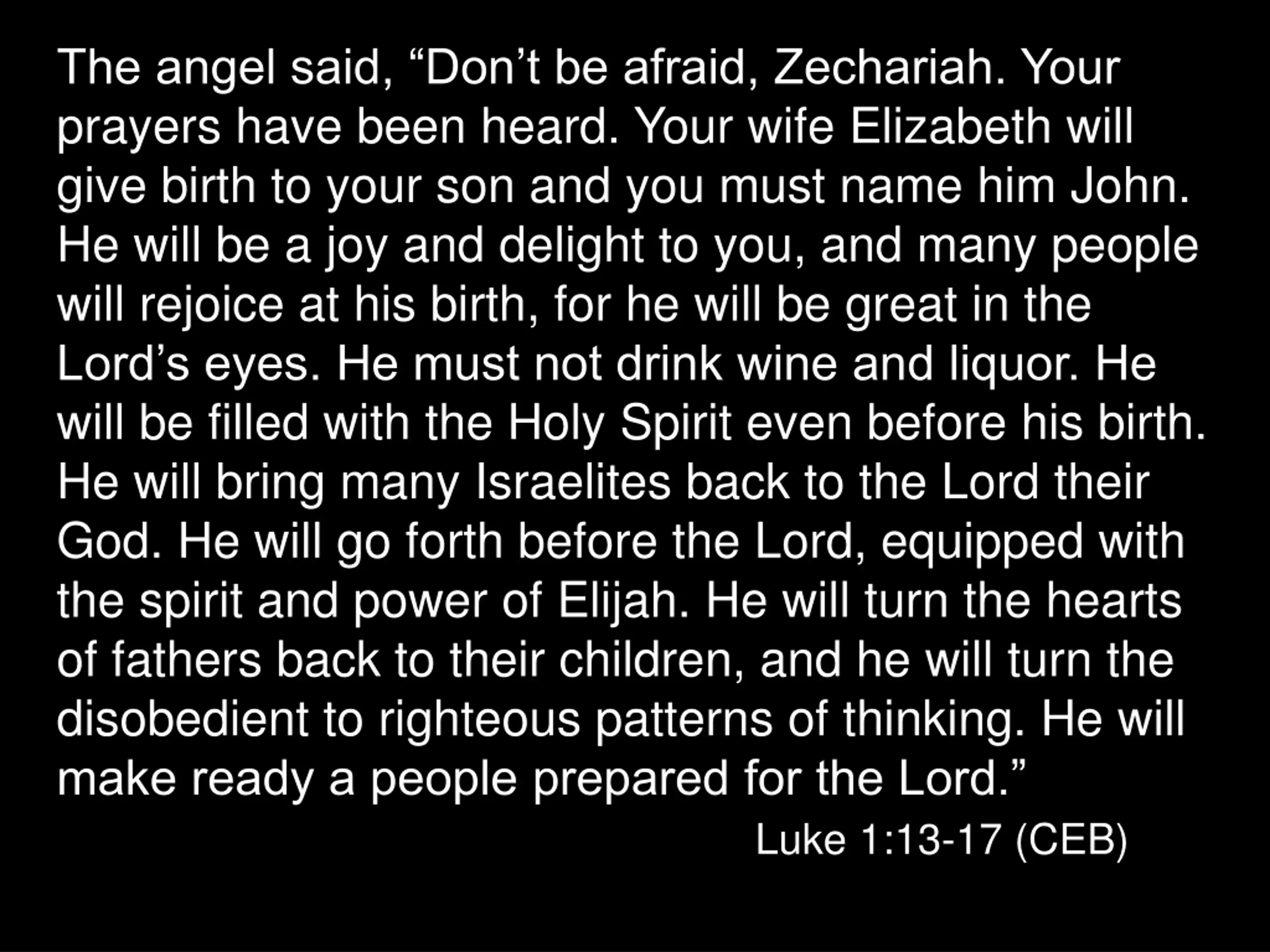 The angel said, Dont be afraid, Zechariah. Your prayers have been heard. Your wife Elizabeth will give birth to your son and you must name him John. He will be a joy and delight to you, and many people will rejoice at his birth, for he will be great in the Lord s eyes. He must not drink wine and liquor. He will be filled with the Holy Spirit even before his birth. He will bring many Israelites back to the Lord their God. He will go forth before the Lord, equipped with the spirit and power of Elijah. He will turn the hearts of fathers back to their children, and he will turn the disobedient to righteous patterns of thinking. He will make ready a people prepared for the Lord. Luke 1:13-17 (CEB)