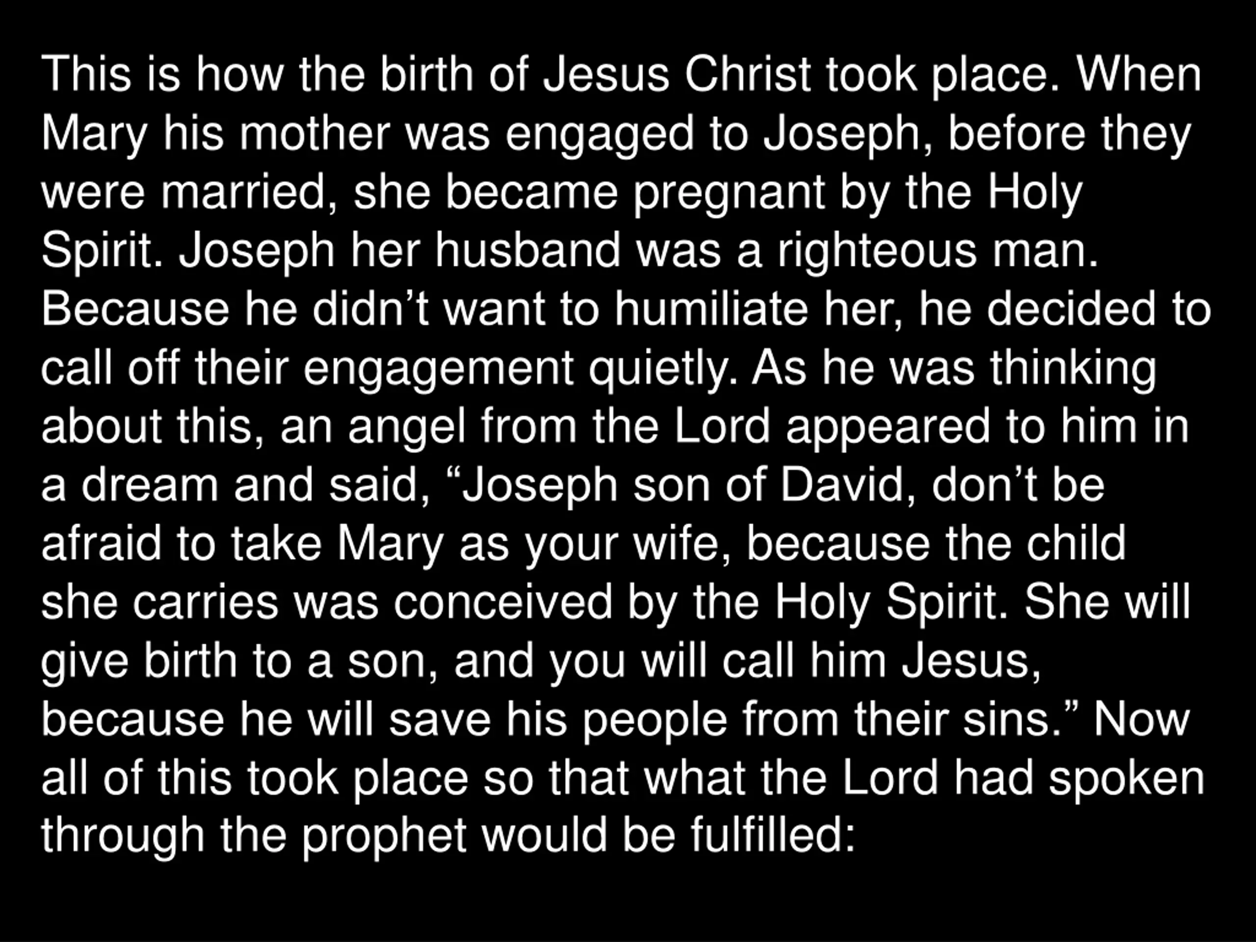 This is how the birth of Jesus Christ took place. When Mary his mother was engaged to Joseph, before they were married, she became pregnant by the Holy Spirit. Joseph her husband was a righteous man. Because he didn t want to humiliate her, he decided to call off their engagement quietly. As he was thinking about this, an angel from the Lord appeared to him in a dream and said, Joseph son of David, don t be afraid to take Mary as your wife, because the child she carries was conceived by the Holy Spirit. She will give birth to a son, and you will call him Jesus, because he will save his people from their sins. Now all of this took place so that what the Lord had spoken through the prophet would be fulfilled: