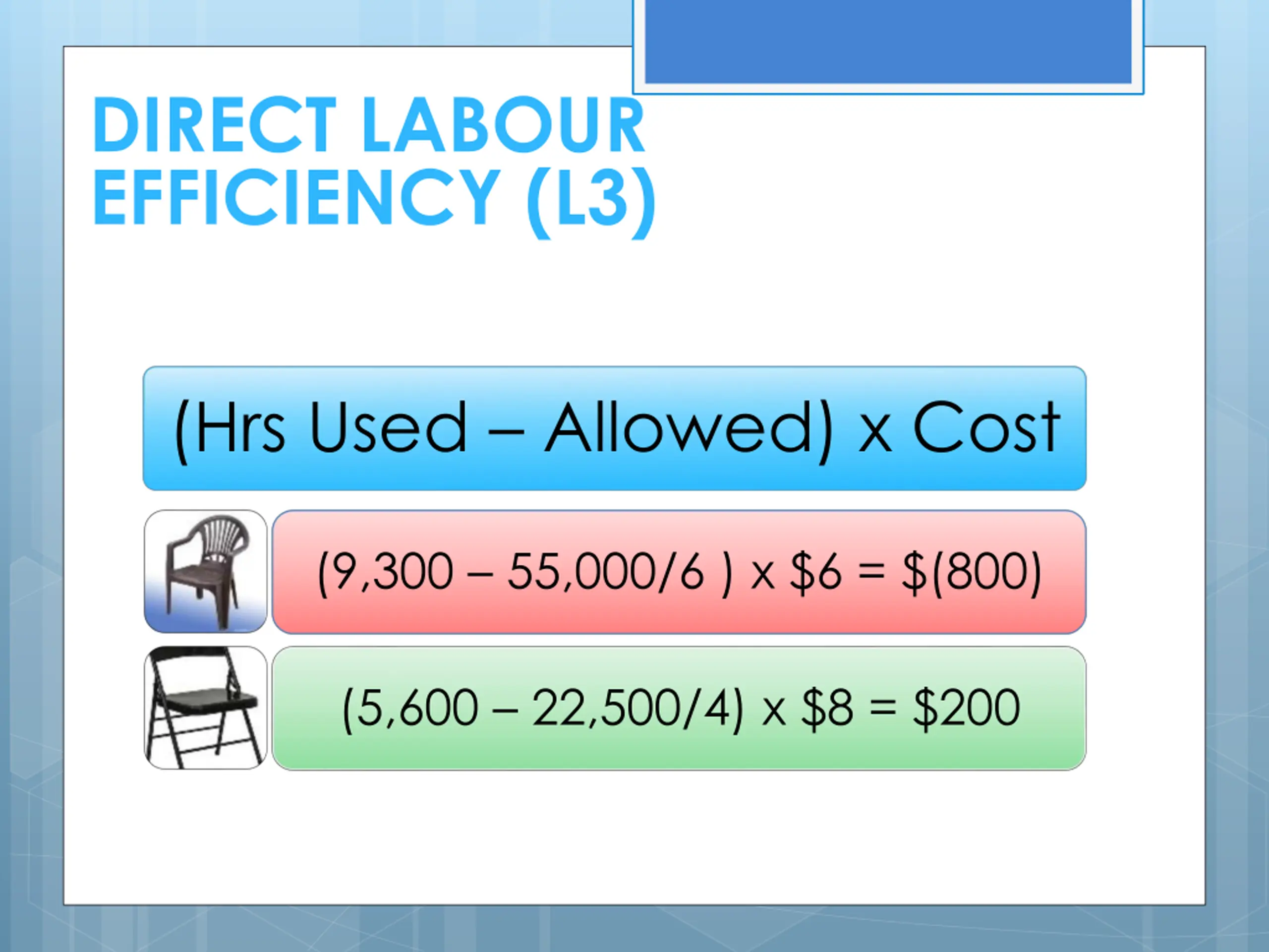 DIRECT LABOUR EFFICIENCY (L3) (Hrs Used Allowed) x Cost (9,300 55,000/6 ) x $6 = $(800) (5,600 22,500/4) x $8 = $200