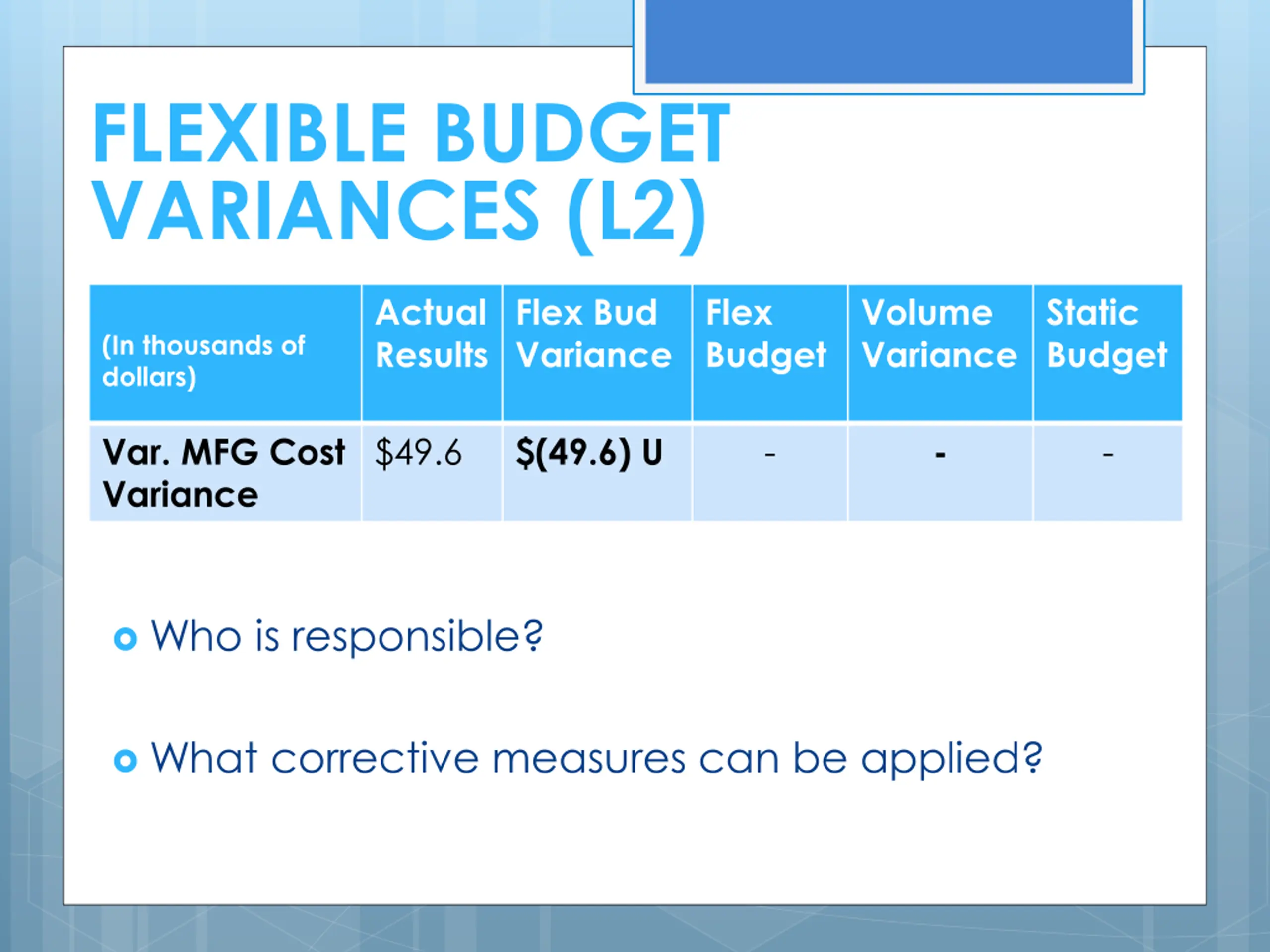 FLEXIBLE BUDGET VARIANCES (L2) Actual Results Flex Bud Variance Flex Budget Volume Variance Static Budget (In thousands of dollars) $49.6 - - Var. MFG Cost Variance $(49.6) U - Who is responsible? What corrective measures can be applied?