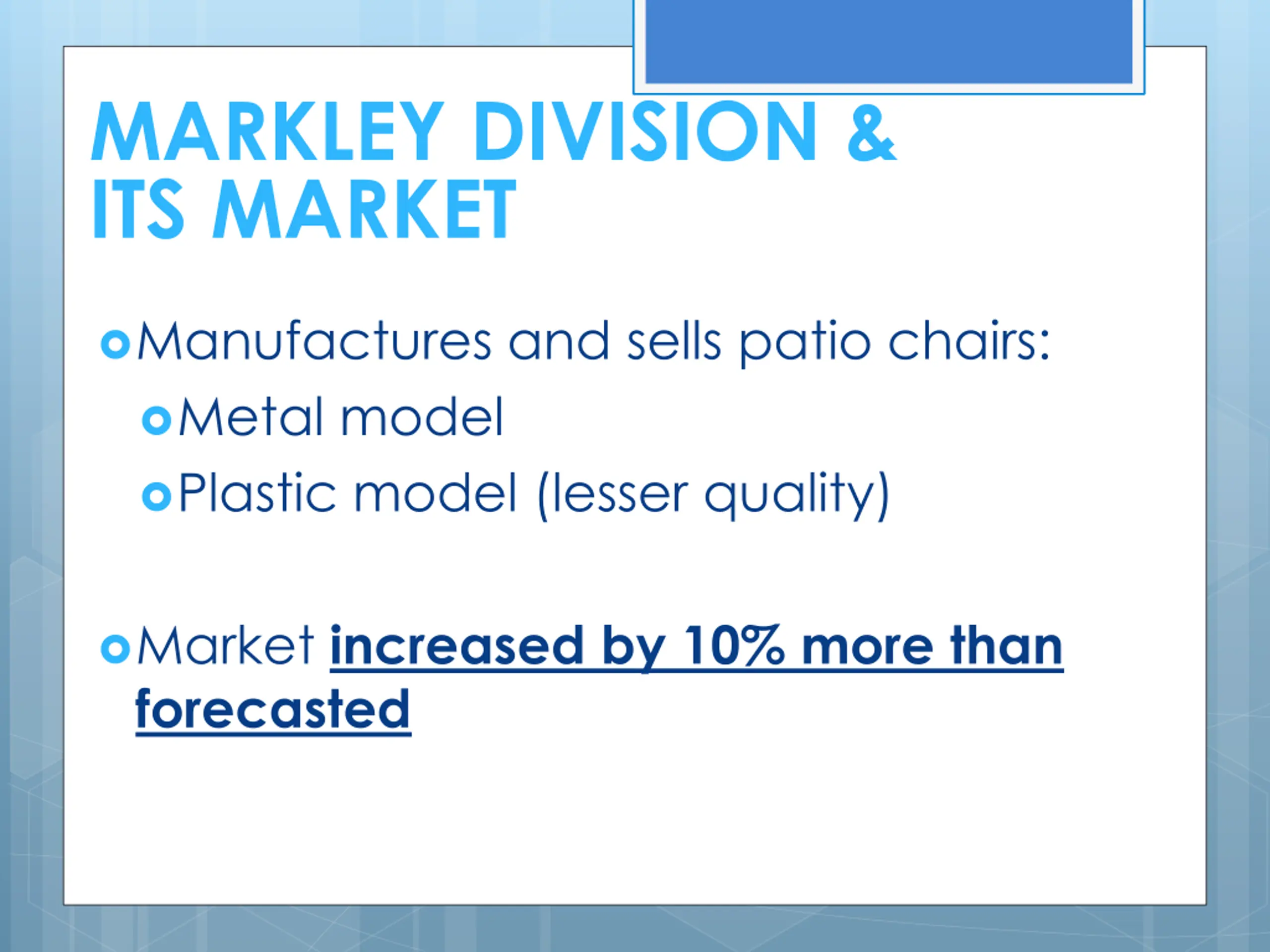 MARKLEY DIVISION & ITS MARKET Manufactures and sells patio chairs: Metal model Plastic model (lesser quality) Market increased by 10% more than forecasted
