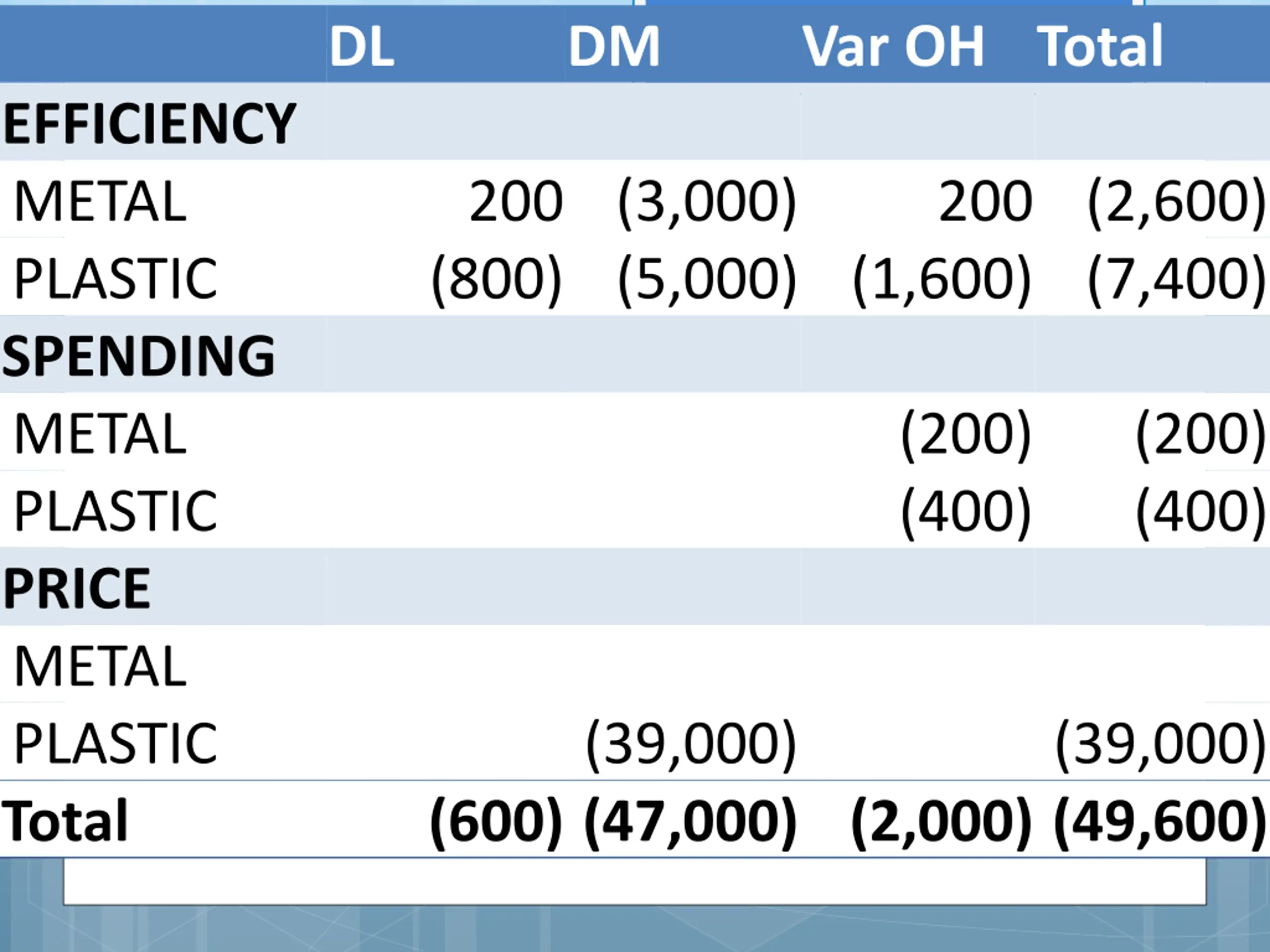 DL DM Var OH Total EFFICIENCY METAL PLASTIC SPENDING METAL PLASTIC PRICE METAL PLASTIC Total 200 (3,000) (800) (5,000) (1,600) (7,400) 200 (2,600) (200) (400) (200) (400) (39,000) (39,000) (600) (47,000) (2,000) (49,600)