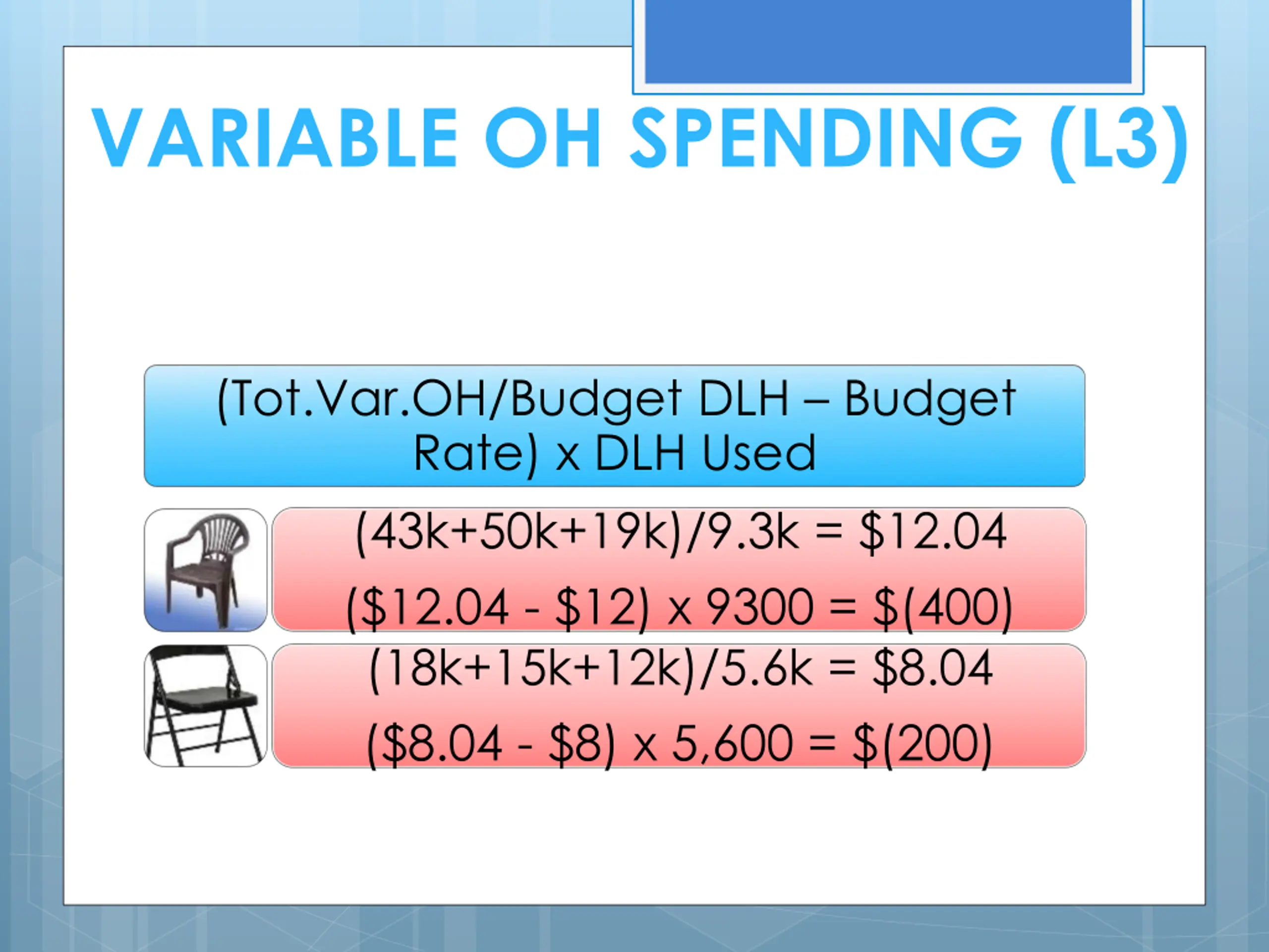 VARIABLE OH SPENDING (L3) (Tot.Var.OH/Budget DLH Budget Rate) x DLH Used (43k+50k+19k)/9.3k = $12.04 ($12.04 - $12) x 9300 = $(400) (18k+15k+12k)/5.6k = $8.04 ($8.04 - $8) x 5,600 = $(200)