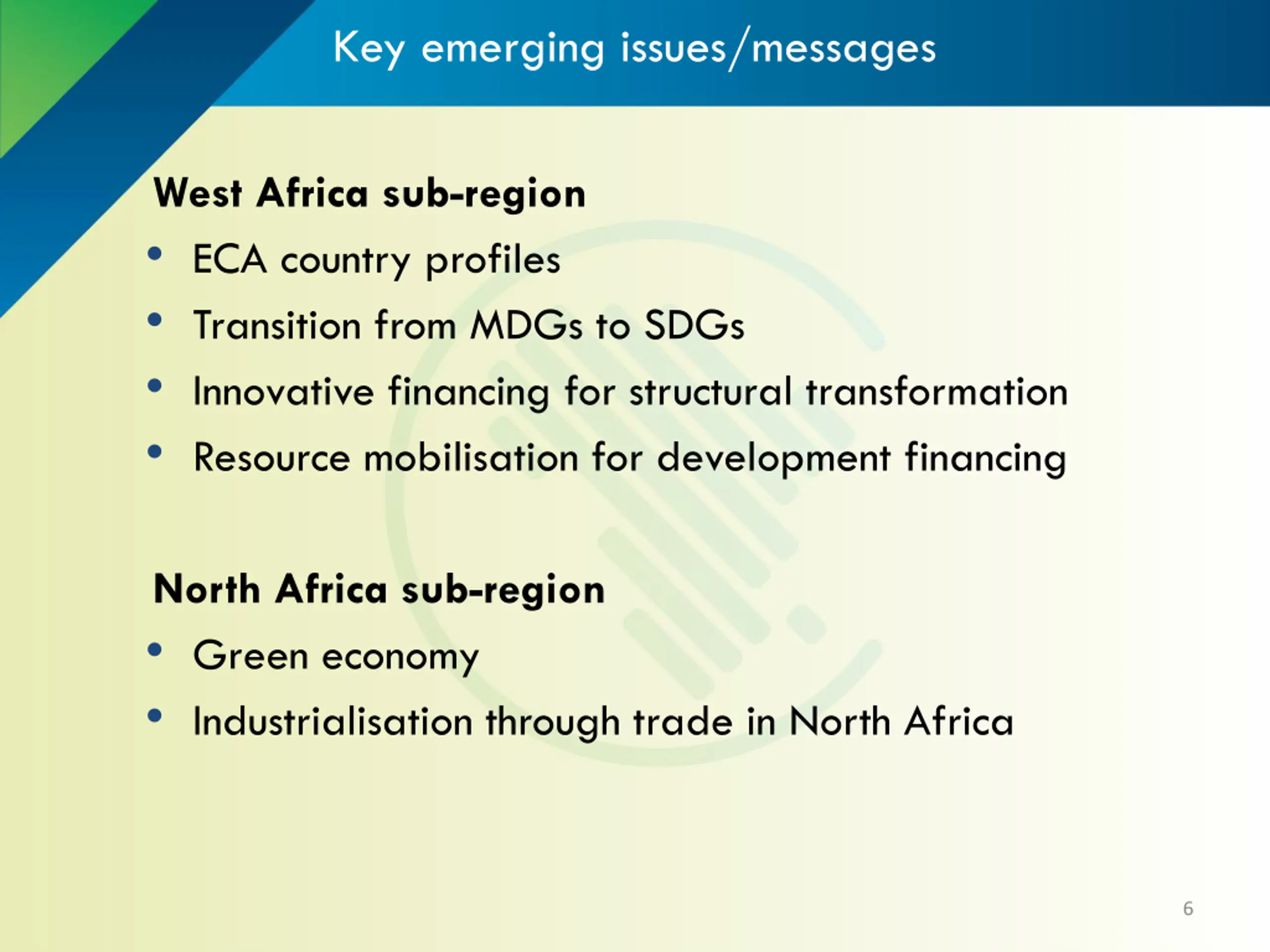 Key emerging issues/messages West Africa sub-region ECA country profiles Transition from MDGs to SDGs Innovative financing for structural transformation Resource mobilisation for development financing North Africa sub-region Green economy Industrialisation through trade in North Africa 6