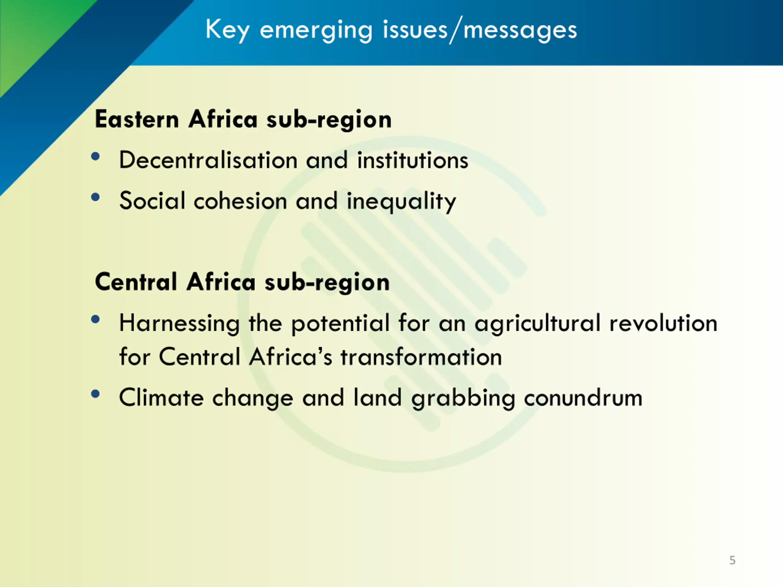 Key emerging issues/messages Eastern Africa sub-region Decentralisation and institutions Social cohesion and inequality Central Africa sub-region Harnessing the potential for an agricultural revolution for Central Africa s transformation Climate change and land grabbing conundrum 5