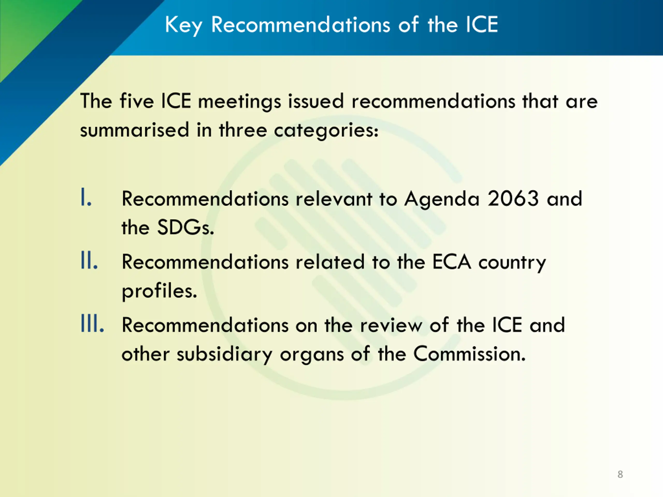 Key Recommendations of the ICE The five ICE meetings issued recommendations that are summarised in three categories: I. Recommendations relevant to Agenda 2063 and the SDGs. Recommendations related to the ECA country profiles. III. Recommendations on the review of the ICE and other subsidiary organs of the Commission. II. 8