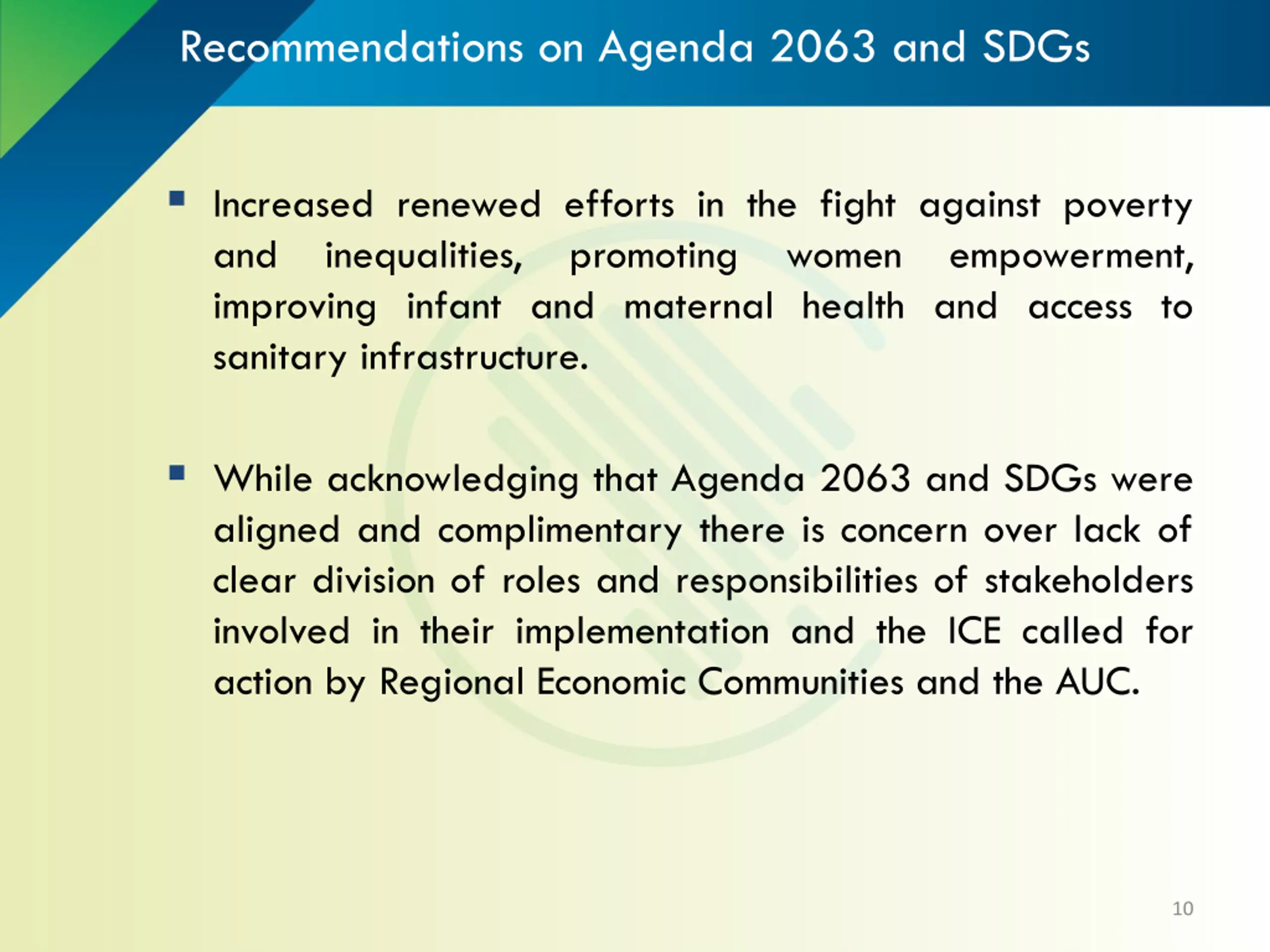 Recommendations on Agenda 2063 and SDGs Increased renewed efforts in the fight against poverty and inequalities, promoting women empowerment, improving infant and maternal health and access to sanitary infrastructure. While acknowledging that Agenda 2063 and SDGs were aligned and complimentary there is concern over lack of clear division of roles and responsibilities of stakeholders involved in their implementation and the ICE called for action by Regional Economic Communities and the AUC. 10