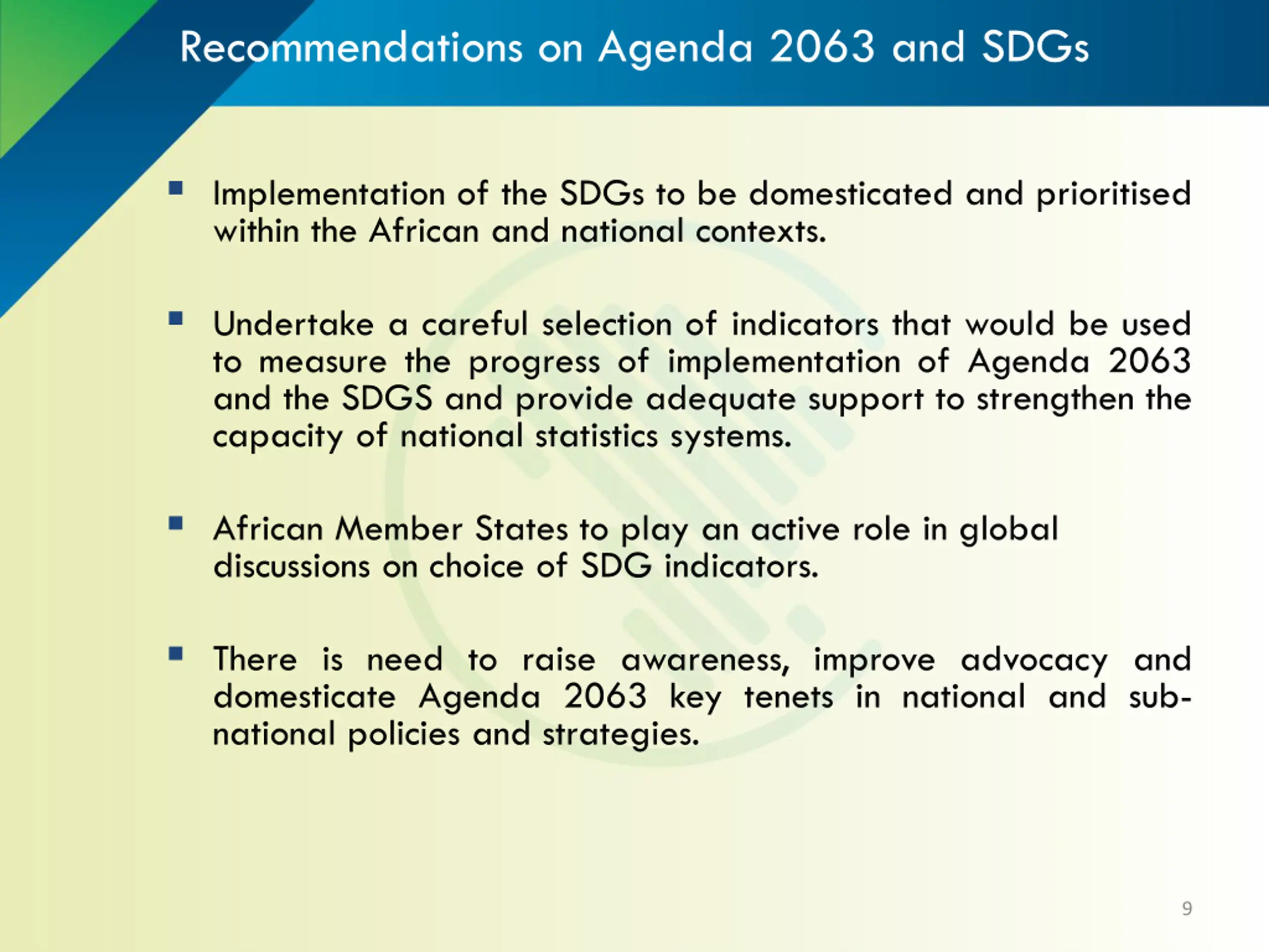 Recommendations on Agenda 2063 and SDGs Implementation of the SDGs to be domesticated and prioritised within the African and national contexts. Undertake a careful selection of indicators that would be used to measure the progress of implementation of Agenda 2063 and the SDGS and provide adequate support to strengthen the capacity of national statistics systems. African Member States to play an active role in global discussions on choice of SDG indicators. There is need to raise awareness, improve advocacy and domesticate Agenda 2063 key tenets in national and sub- national policies and strategies. 9
