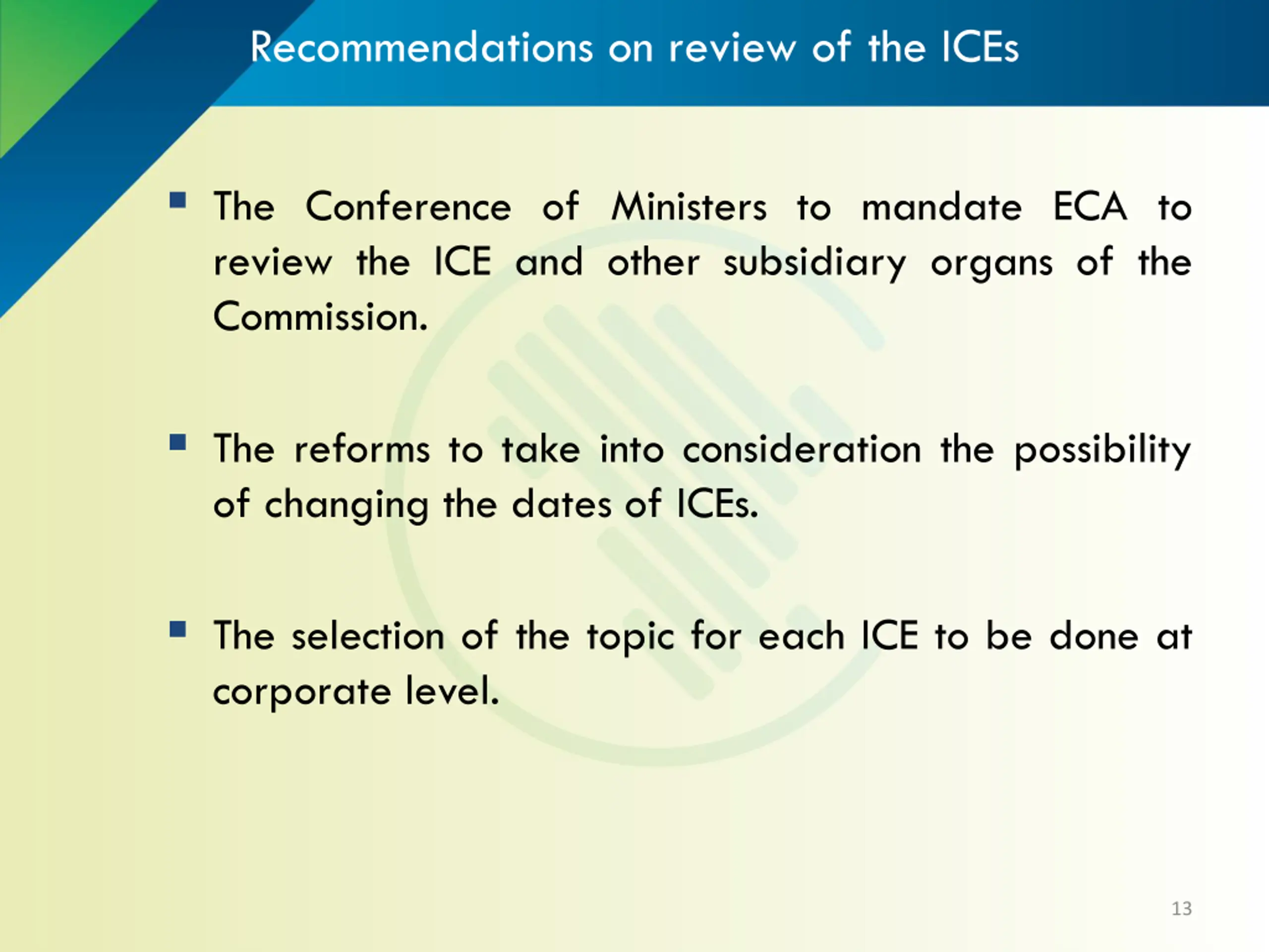 Recommendations on review of the ICEs The Conference of Ministers to mandate ECA to review the ICE and other subsidiary organs of the Commission. The reforms to take into consideration the possibility of changing the dates of ICEs. The selection of the topic for each ICE to be done at corporate level. 13