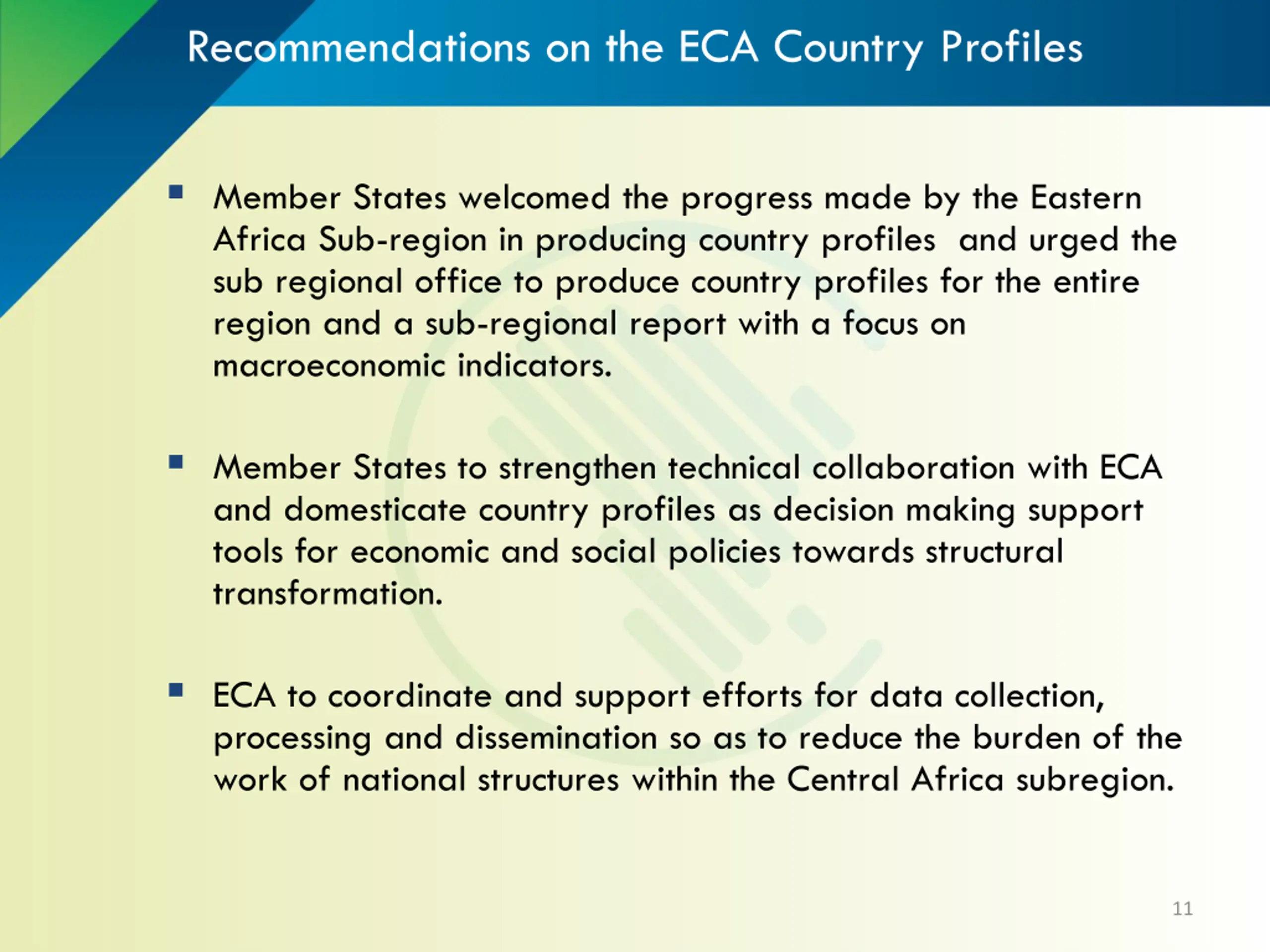 Recommendations on the ECA Country Profiles Member States welcomed the progress made by the Eastern Africa Sub-region in producing country profiles and urged the sub regional office to produce country profiles for the entire region and a sub-regional report with a focus on macroeconomic indicators. Member States to strengthen technical collaboration with ECA and domesticate country profiles as decision making support tools for economic and social policies towards structural transformation. ECA to coordinate and support efforts for data collection, processing and dissemination so as to reduce the burden of the work of national structures within the Central Africa subregion. 11