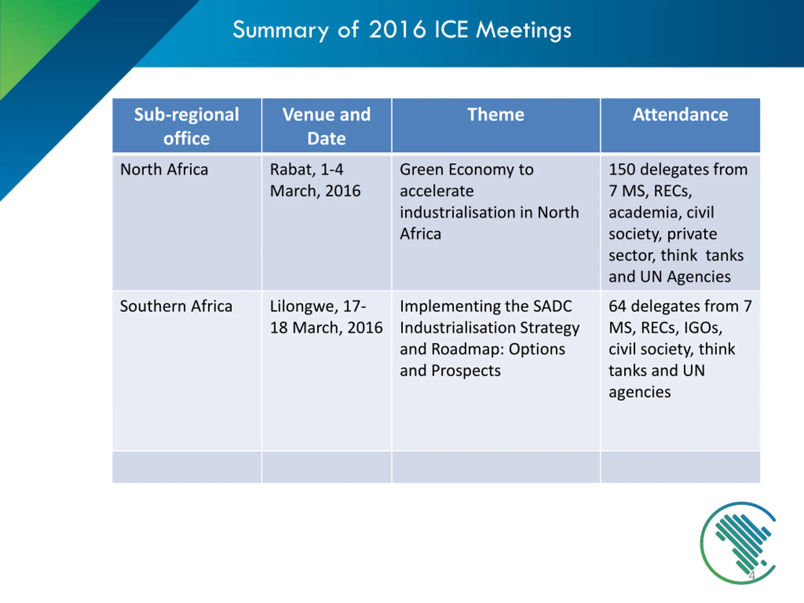 Summary of 2016 ICE Meetings Sub-regional office Venue and Date Theme Attendance North Africa Rabat, 1-4 March, 2016 Green Economy to accelerate industrialisation in North Africa 150 delegates from 7 MS, RECs, academia, civil society, private sector, think tanks and UN Agencies Southern Africa Lilongwe, 17- 18 March, 2016 Implementing the SADC Industrialisation Strategy and Roadmap: Options and Prospects 64 delegates from 7 MS, RECs, IGOs, civil society, think tanks and UN agencies 4