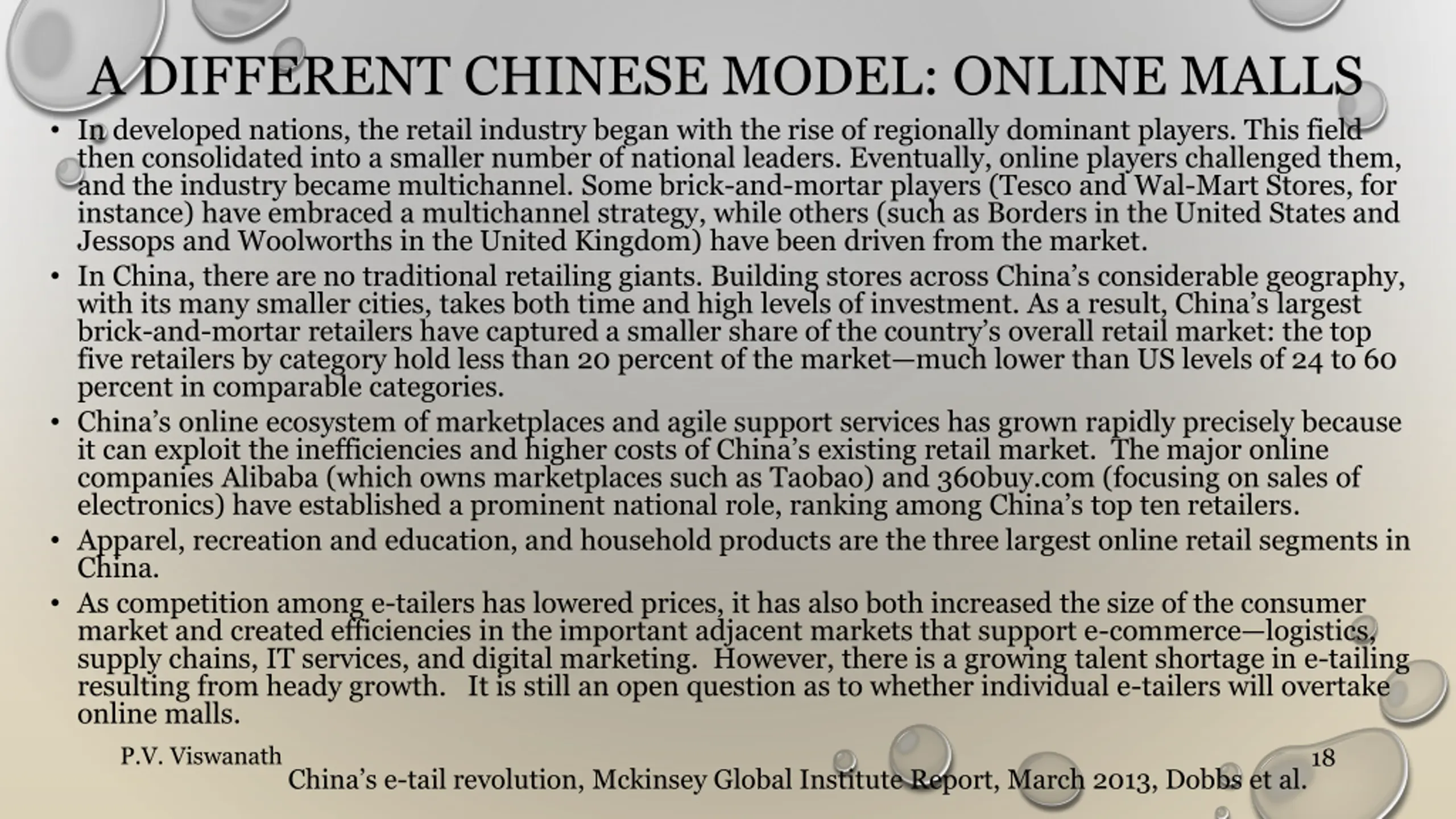 A DIFFERENT CHINESE MODEL: ONLINE MALLS In developed nations, the retail industry began with the rise of regionally dominant players. This field then consolidated into a smaller number of national leaders. Eventually, online players challenged them, and the industry became multichannel. Some brick-and-mortar players (Tesco and Wal-Mart Stores, for instance) have embraced a multichannel strategy, while others (such as Borders in the United States and Jessops and Woolworths in the United Kingdom) have been driven from the market. In China, there are no traditional retailing giants. Building stores across China s considerable geography, with its many smaller cities, takes both time and high levels of investment. As a result, China s largest brick-and-mortar retailers have captured a smaller share of the country s overall retail market: the top five retailers by category hold less than 20 percent of the market much lower than US levels of 24 to 60 percent in comparable categories. China s online ecosystem of marketplaces and agile support services has grown rapidly precisely because it can exploit the inefficiencies and higher costs of China s existing retail market. The major online companies Alibaba (which owns marketplaces such as Taobao) and 360buy.com (focusing on sales of electronics) have established a prominent national role, ranking among China s top ten retailers. Apparel, recreation and education, and household products are the three largest online retail segments in China. As competition among e-tailers has lowered prices, it has also both increased the size of the consumer market and created efficiencies in the important adjacent markets that support e-commerce logistics, supply chains, IT services, and digital marketing. However, there is a growing talent shortage in e-tailing resulting from heady growth. It is still an open question as to whether individual e-tailers will overtake online malls. P.V. Viswanath 18 China s e-tail revolution, Mckinsey Global Institute Report, March 2013, Dobbs et al.