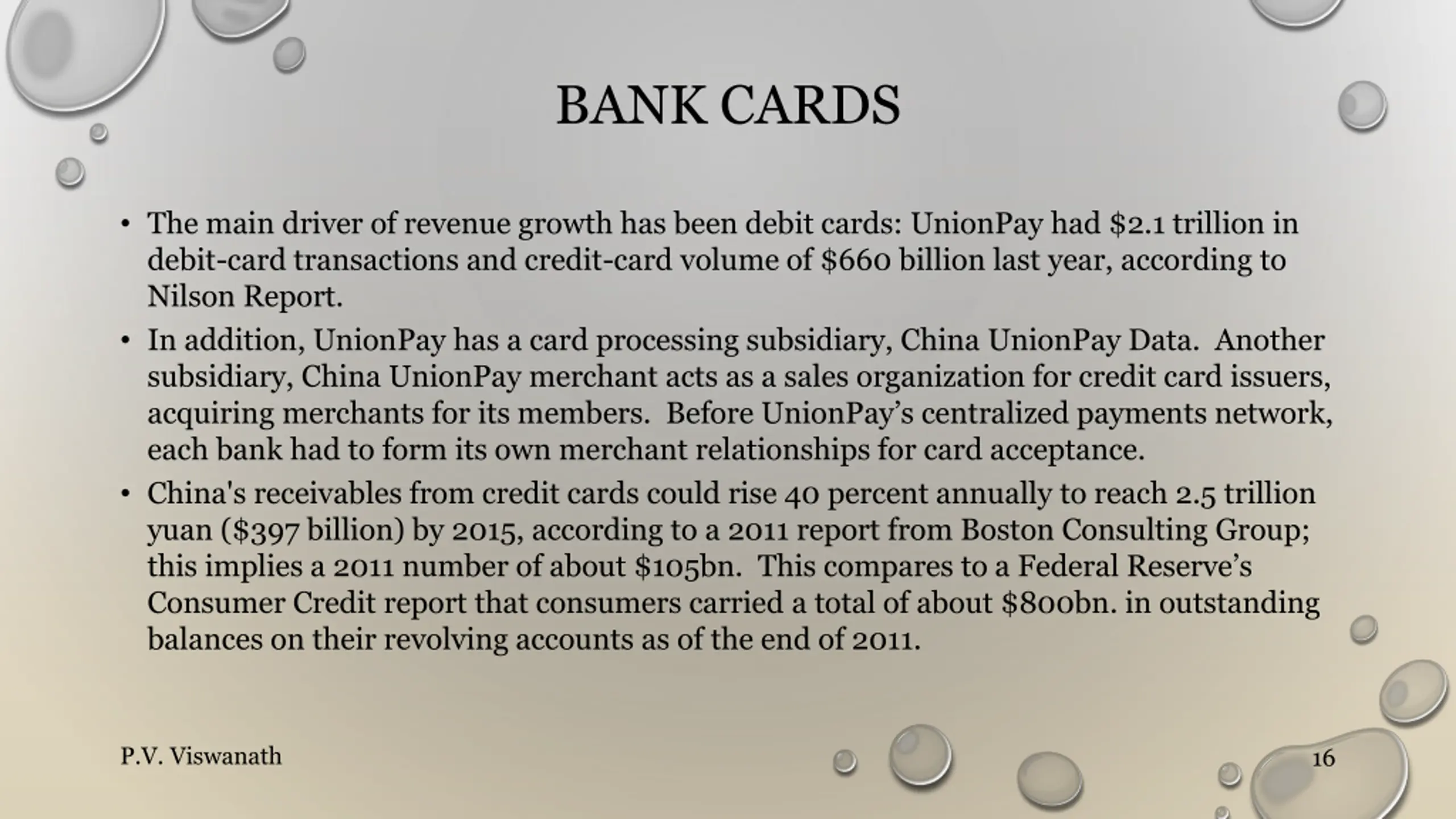 BANK CARDS The main driver of revenue growth has been debit cards: UnionPay had $2.1 trillion in debit-card transactions and credit-card volume of $660 billion last year, according to Nilson Report. In addition, UnionPay has a card processing subsidiary, China UnionPay Data. Another subsidiary, China UnionPay merchant acts as a sales organization for credit card issuers, acquiring merchants for its members. Before UnionPay s centralized payments network, each bank had to form its own merchant relationships for card acceptance. China's receivables from credit cards could rise 40 percent annually to reach 2.5 trillion yuan ($397 billion) by 2015, according to a 2011 report from Boston Consulting Group; this implies a 2011 number of about $105bn. This compares to a Federal Reserve s Consumer Credit report that consumers carried a total of about $800bn. in outstanding balances on their revolving accounts as of the end of 2011. P.V. Viswanath 16