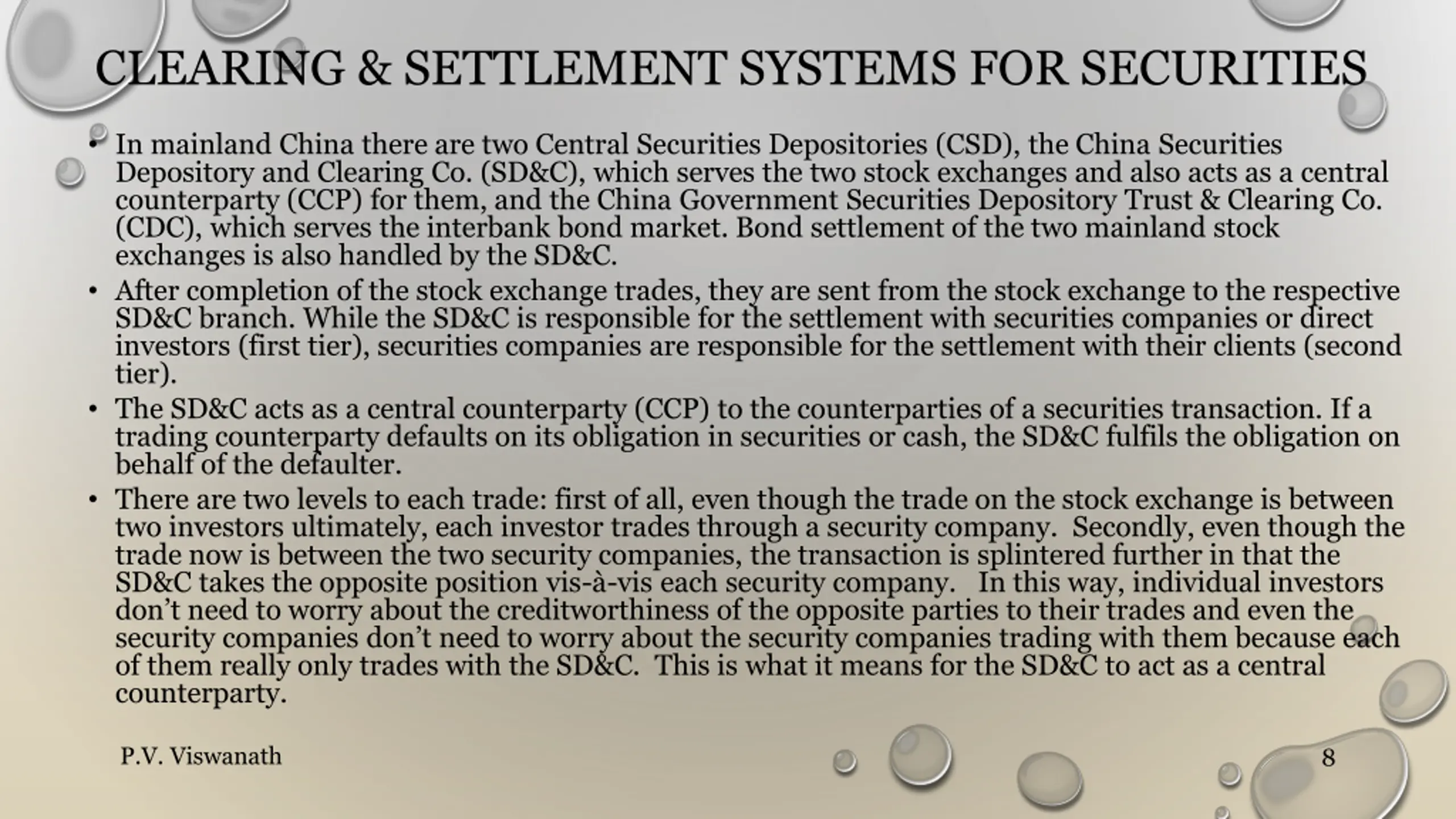 CLEARING & SETTLEMENT SYSTEMS FOR SECURITIES In mainland China there are two Central Securities Depositories (CSD), the China Securities Depository and Clearing Co. (SD&C), which serves the two stock exchanges and also acts as a central counterparty (CCP) for them, and the China Government Securities Depository Trust & Clearing Co. (CDC), which serves the interbank bond market. Bond settlement of the two mainland stock exchanges is also handled by the SD&C. After completion of the stock exchange trades, they are sent from the stock exchange to the respective SD&C branch. While the SD&C is responsible for the settlement with securities companies or direct investors (first tier), securities companies are responsible for the settlement with their clients (second tier). The SD&C acts as a central counterparty (CCP) to the counterparties of a securities transaction. If a trading counterparty defaults on its obligation in securities or cash, the SD&C fulfils the obligation on behalf of the defaulter. There are two levels to each trade: first of all, even though the trade on the stock exchange is between two investors ultimately, each investor trades through a security company. Secondly, even though the trade now is between the two security companies, the transaction is splintered further in that the SD&C takes the opposite position vis- -vis each security company. In this way, individual investors don t need to worry about the creditworthiness of the opposite parties to their trades and even the security companies don t need to worry about the security companies trading with them because each of them really only trades with the SD&C. This is what it means for the SD&C to act as a central counterparty. P.V. Viswanath 8