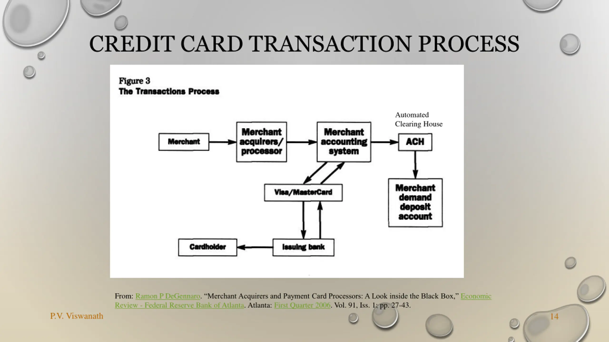 CREDIT CARD TRANSACTION PROCESS Automated Clearing House From: Ramon P DeGennaro. Merchant Acquirers and Payment Card Processors: A Look inside the Black Box, Economic Review - Federal Reserve Bank of Atlanta. Atlanta: First Quarter 2006. Vol. 91, Iss. 1; pp. 27-43. P.V. Viswanath 14