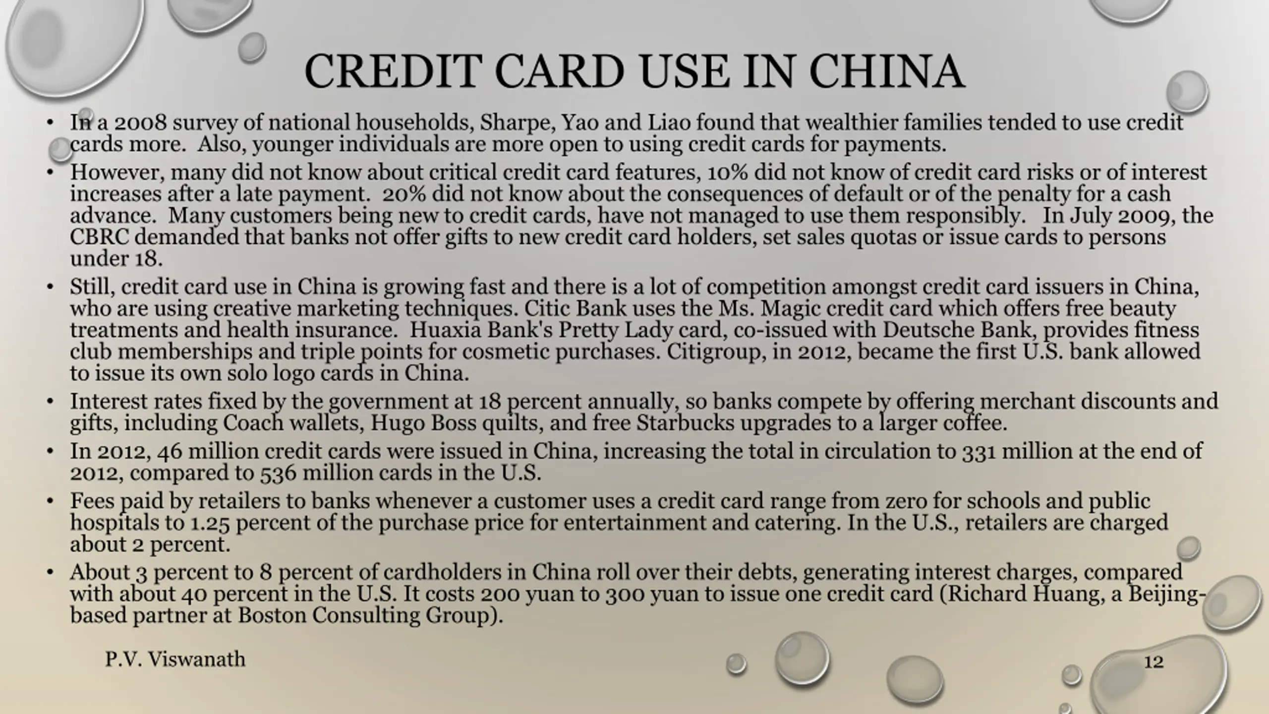 CREDIT CARD USE IN CHINA In a 2008 survey of national households, Sharpe, Yao and Liao found that wealthier families tended to use credit cards more. Also, younger individuals are more open to using credit cards for payments. However, many did not know about critical credit card features, 10% did not know of credit card risks or of interest increases after a late payment. 20% did not know about the consequences of default or of the penalty for a cash advance. Many customers being new to credit cards, have not managed to use them responsibly. In July 2009, the CBRC demanded that banks not offer gifts to new credit card holders, set sales quotas or issue cards to persons under 18. Still, credit card use in China is growing fast and there is a lot of competition amongst credit card issuers in China, who are using creative marketing techniques. Citic Bank uses the Ms. Magic credit card which offers free beauty treatments and health insurance. Huaxia Bank's Pretty Lady card, co-issued with Deutsche Bank, provides fitness club memberships and triple points for cosmetic purchases. Citigroup, in 2012, became the first U.S. bank allowed to issue its own solo logo cards in China. Interest rates fixed by the government at 18 percent annually, so banks compete by offering merchant discounts and gifts, including Coach wallets, Hugo Boss quilts, and free Starbucks upgrades to a larger coffee. In 2012, 46 million credit cards were issued in China, increasing the total in circulation to 331 million at the end of 2012, compared to 536 million cards in the U.S. Fees paid by retailers to banks whenever a customer uses a credit card range from zero for schools and public hospitals to 1.25 percent of the purchase price for entertainment and catering. In the U.S., retailers are charged about 2 percent. About 3 percent to 8 percent of cardholders in China roll over their debts, generating interest charges, compared with about 40 percent in the U.S. It costs 200 yuan to 300 yuan to issue one credit card (Richard Huang, a Beijing- based partner at Boston Consulting Group). P.V. Viswanath 12
