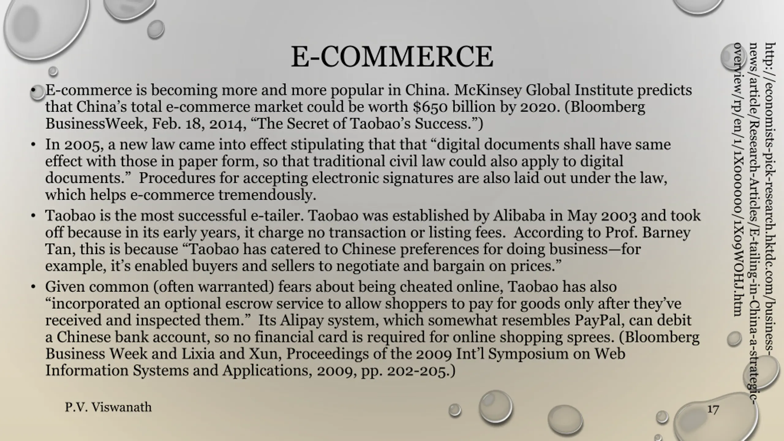 E-COMMERCE overview/rp/en/1/1X000000/1X09WOHJ.htm news/article/Research-Articles/E-tailing-in-China-a-strategic- http://economists-pick-research.hktdc.com/business- E-commerce is becoming more and more popular in China. McKinsey Global Institute predicts that China s total e-commerce market could be worth $650 billion by 2020. (Bloomberg BusinessWeek, Feb. 18, 2014, The Secret of Taobao sSuccess. ) In 2005, a new law came into effect stipulating that that digital documents shall have same effect with those in paper form, so that traditional civil law could also apply to digital documents. Procedures for accepting electronic signatures are also laid out under the law, which helps e-commerce tremendously. Taobao is the most successful e-tailer. Taobao was established by Alibaba in May 2003 and took off because in its early years, it charge no transaction or listing fees. According to Prof. Barney Tan, this is because Taobao has catered to Chinese preferences for doing business for example, it s enabled buyers and sellers to negotiate and bargain on prices. Given common (often warranted) fears about being cheated online, Taobao has also incorporated an optional escrow service to allow shoppers to pay for goods only after they ve received and inspected them. Its Alipay system, which somewhat resembles PayPal, can debit a Chinese bank account, so no financial card is required for online shopping sprees. (Bloomberg Business Week and Lixia and Xun, Proceedings of the 2009 Int l Symposium on Web Information Systems and Applications, 2009, pp. 202-205.) P.V. Viswanath 17