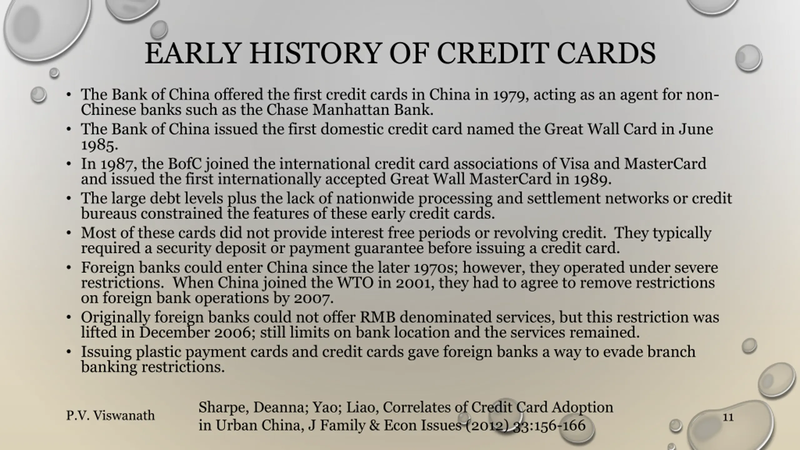 EARLY HISTORY OF CREDIT CARDS The Bank of China offered the first credit cards in China in 1979, acting as an agent for non- Chinese banks such as the Chase Manhattan Bank. The Bank of China issued the first domestic credit card named the Great Wall Card in June 1985. In 1987, the BofC joined the international credit card associations of Visa and MasterCard and issued the first internationally accepted Great Wall MasterCard in 1989. The large debt levels plus the lack of nationwide processing and settlement networks or credit bureaus constrained the features of these early credit cards. Most of these cards did not provide interest free periods or revolving credit. They typically required a security deposit or payment guarantee before issuing a credit card. Foreign banks could enter China since the later 1970s; however, they operated under severe restrictions. When China joined the WTO in 2001, they had to agree to remove restrictions on foreign bank operations by 2007. Originally foreign banks could not offer RMB denominated services, but this restriction was lifted in December 2006; still limits on bank location and the services remained. Issuing plastic payment cards and credit cards gave foreign banks a way to evade branch banking restrictions. Sharpe, Deanna; Yao; Liao, Correlates of Credit Card Adoption in Urban China, J Family & Econ Issues (2012) 33:156-166 P.V. Viswanath 11