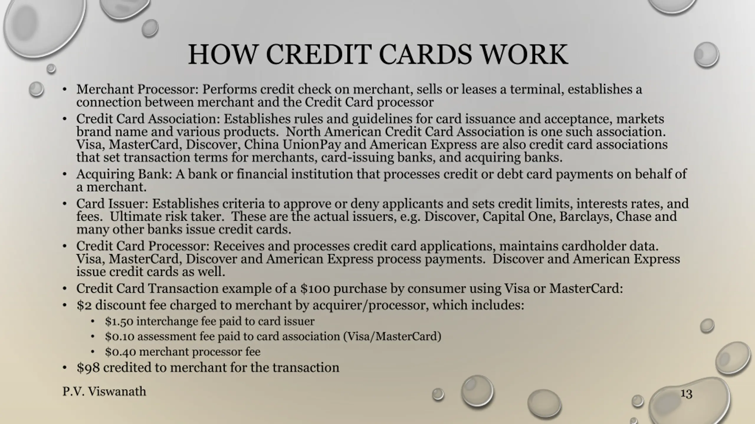 HOW CREDIT CARDS WORK Merchant Processor: Performs credit check on merchant, sells or leases a terminal, establishes a connection between merchant and the Credit Card processor Credit Card Association: Establishes rules and guidelines for card issuance and acceptance, markets brand name and various products. North American Credit Card Association is one such association. Visa, MasterCard, Discover, China UnionPay and American Express are also credit card associations that set transaction terms for merchants, card-issuing banks, and acquiring banks. Acquiring Bank: A bank or financial institution that processes credit or debt card payments on behalf of a merchant. Card Issuer: Establishes criteria to approve or deny applicants and sets credit limits, interests rates, and fees. Ultimate risk taker. These are the actual issuers, e.g. Discover, Capital One, Barclays, Chase and many other banks issue credit cards. Credit Card Processor: Receives and processes credit card applications, maintains cardholder data. Visa, MasterCard, Discover and American Express process payments. Discover and American Express issue credit cards as well. Credit Card Transaction example of a $100 purchase by consumer using Visa or MasterCard: $2 discount fee charged to merchant by acquirer/processor, which includes: $1.50 interchange fee paid to card issuer $0.10 assessment fee paid to card association (Visa/MasterCard) $0.40 merchant processor fee $98 credited to merchant for the transaction P.V. Viswanath 13