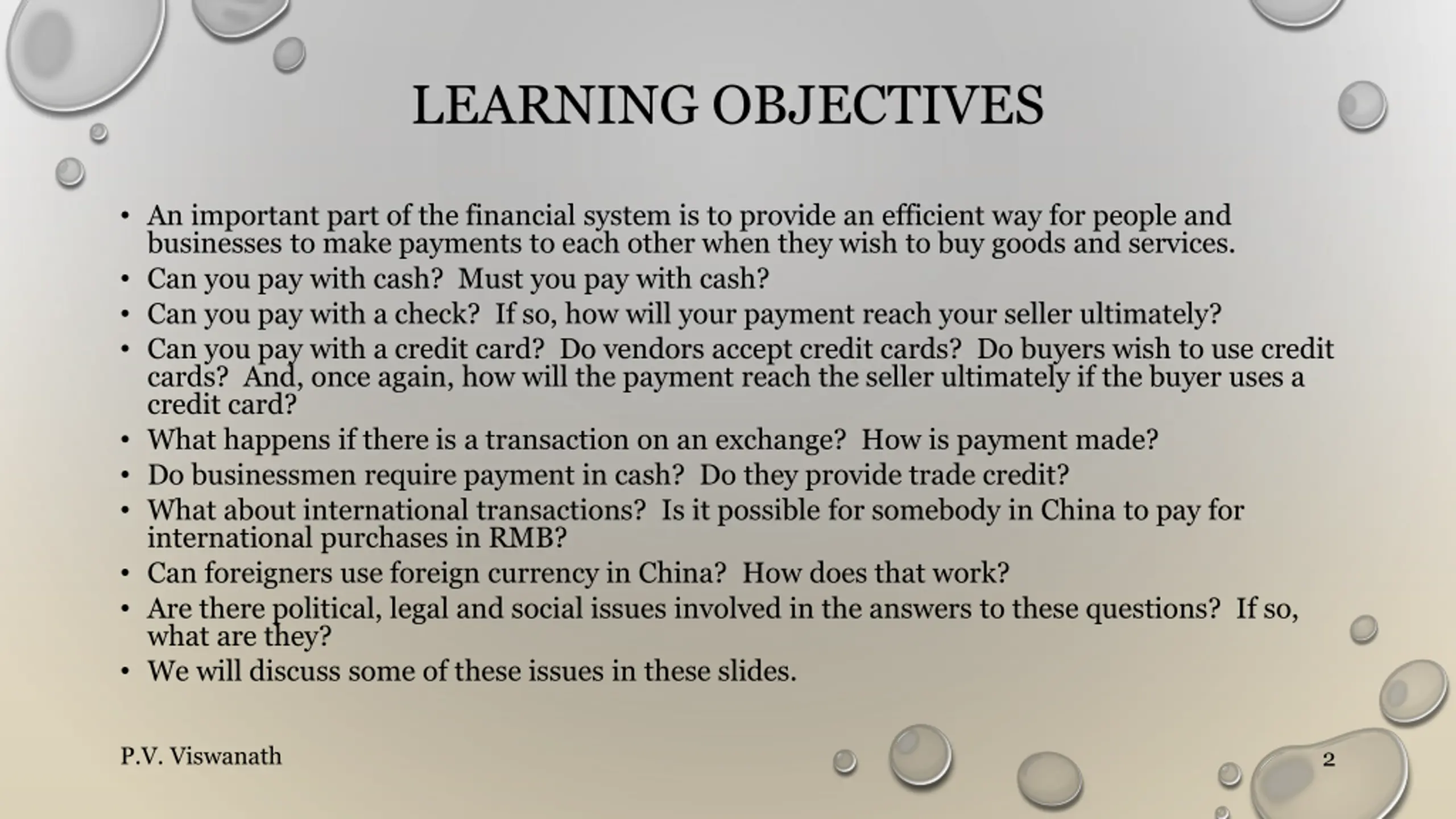 LEARNING OBJECTIVES An important part of the financial system is to provide an efficient way for people and businesses to make payments to each other when they wish to buy goods and services. Can you pay with cash? Must you pay with cash? Can you pay with a check? If so, how will your payment reach your seller ultimately? Can you pay with a credit card? Do vendors accept credit cards? Do buyers wish to use credit cards? And, once again, how will the payment reach the seller ultimately if the buyer uses a credit card? What happens if there is a transaction on an exchange? How is payment made? Do businessmen require payment in cash? Do they provide trade credit? What about international transactions? Is it possible for somebody in China to pay for international purchases in RMB? Can foreigners use foreign currency in China? How does that work? Are there political, legal and social issues involved in the answers to these questions? If so, what are they? We will discuss some of these issues in these slides. P.V. Viswanath 2