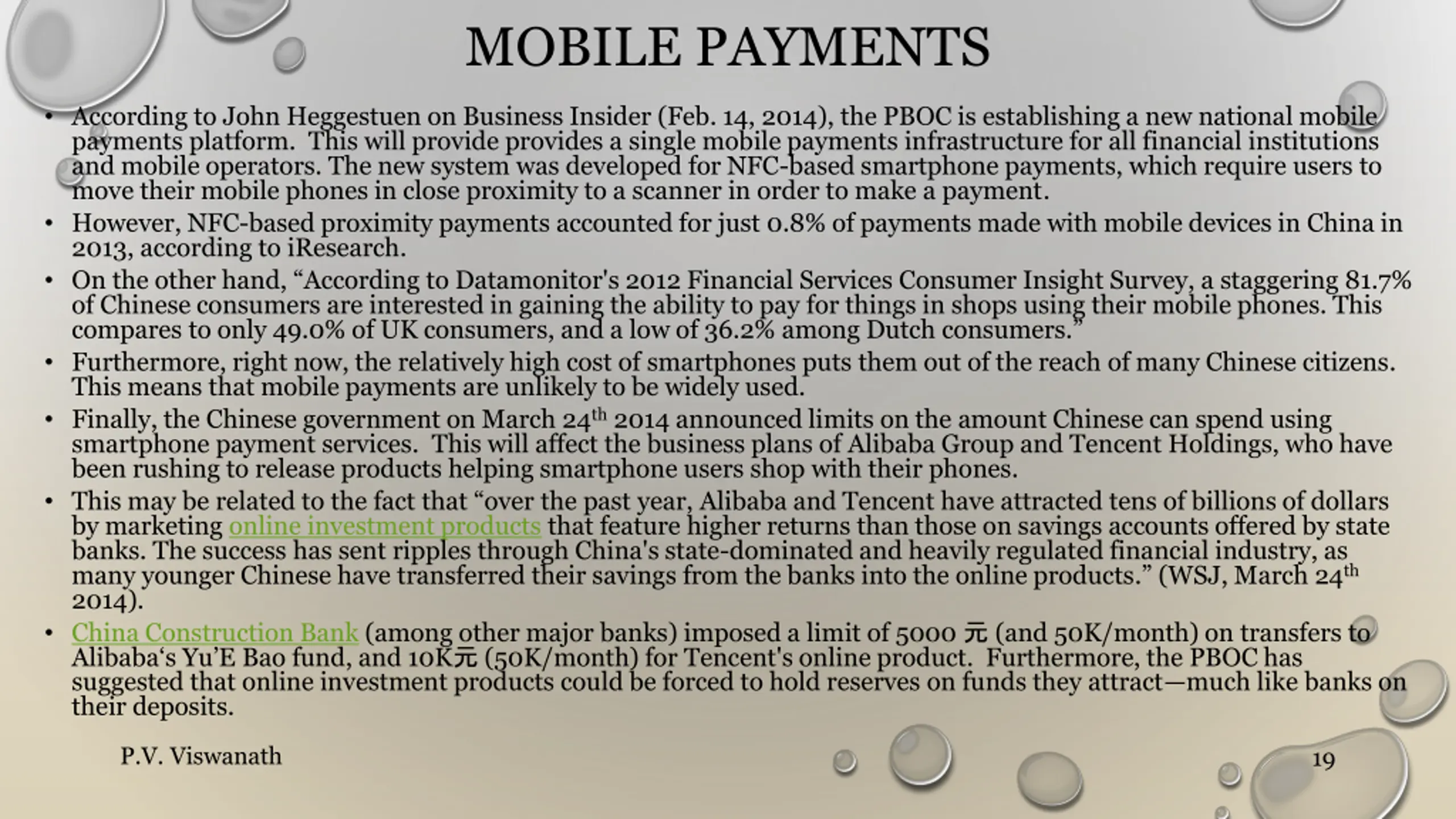 MOBILE PAYMENTS According to John Heggestuen on Business Insider (Feb. 14, 2014), the PBOC is establishing a new national mobile payments platform. This will provide provides a single mobile payments infrastructure for all financial institutions and mobile operators. The new system was developed for NFC-based smartphone payments, which require users to move their mobile phones in close proximity to a scanner in order to make a payment. However, NFC-based proximity payments accounted for just 0.8% of payments made with mobile devices in China in 2013, according to iResearch. On the other hand, According to Datamonitor's 2012 Financial Services Consumer Insight Survey, a staggering 81.7% of Chinese consumers are interested in gaining the ability to pay for things in shops using their mobile phones. This compares to only 49.0% of UK consumers, and a low of 36.2% among Dutch consumers. Furthermore, right now, the relatively high cost of smartphones puts them out of the reach of many Chinese citizens. This means that mobile payments are unlikely to be widely used. Finally, the Chinese government on March 24th 2014 announced limits on the amount Chinese can spend using smartphone payment services. This will affect the business plans of Alibaba Group and Tencent Holdings, who have been rushing to release products helping smartphone users shop with their phones. This may be related to the fact that over the past year, Alibaba and Tencent have attracted tens of billions of dollars by marketing online investment products that feature higher returns than those on savings accounts offered by state banks. The success has sent ripples through China's state-dominated and heavily regulated financial industry, as many younger Chinese have transferred their savings from the banks into the online products. (WSJ, March 24th 2014). China Construction Bank (among other major banks) imposed a limit of 5000 (and 50K/month) on transfers to Alibaba sYu E Bao fund, and 10K (50K/month) for Tencent's online product. Furthermore, the PBOC has suggested that online investment products could be forced to hold reserves on funds they attract much like banks on their deposits. P.V. Viswanath 19