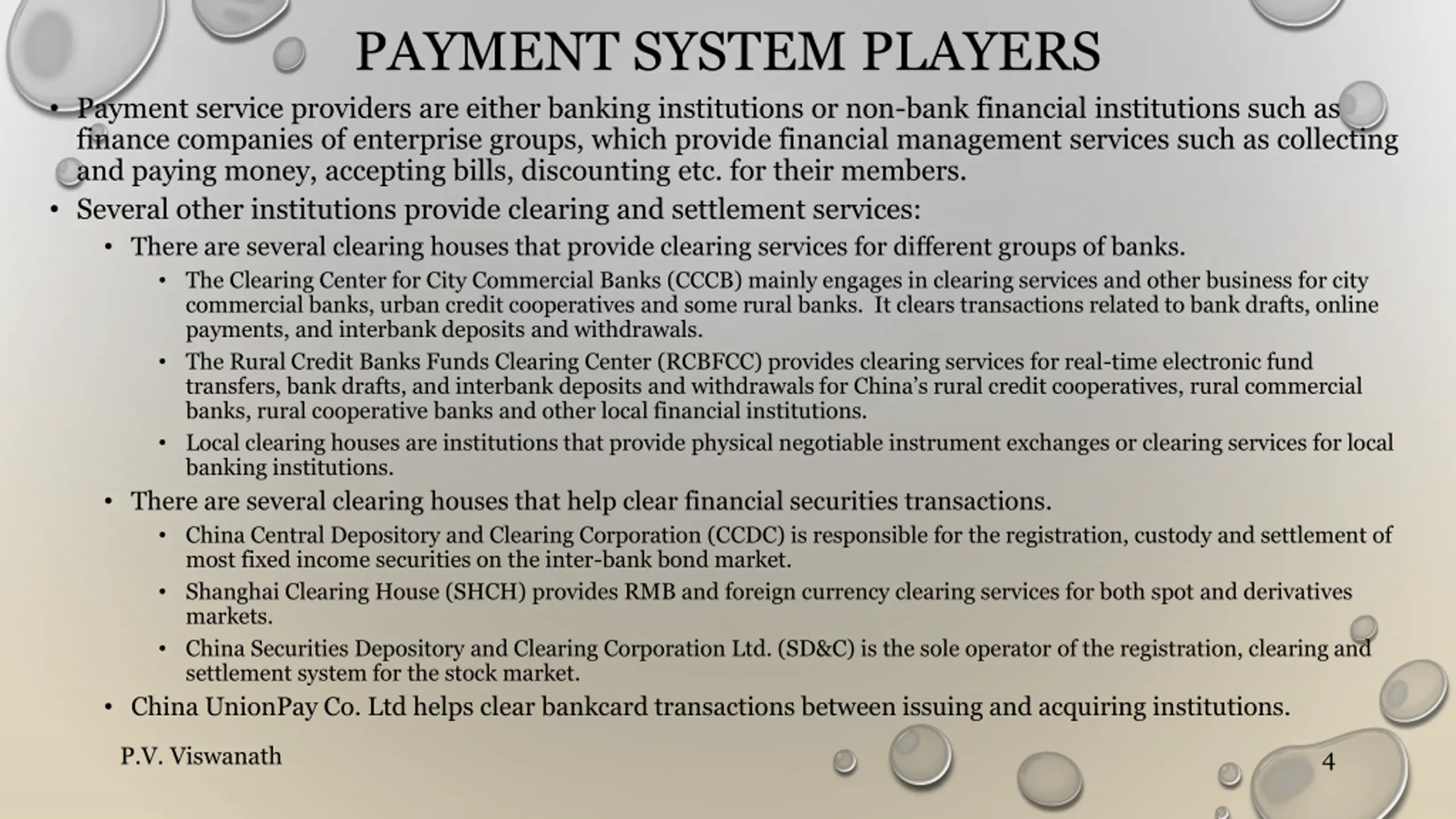 PAYMENT SYSTEM PLAYERS Payment service providers are either banking institutions or non-bank financial institutions such as finance companies of enterprise groups, which provide financial management services such as collecting and paying money, accepting bills, discounting etc. for their members. Several other institutions provide clearing and settlement services: There are several clearing houses that provide clearing services for different groups of banks. The Clearing Center for City Commercial Banks (CCCB) mainly engages in clearing services and other business for city commercial banks, urban credit cooperatives and some rural banks. It clears transactions related to bank drafts, online payments, and interbank deposits and withdrawals. The Rural Credit Banks Funds Clearing Center (RCBFCC) provides clearing services for real-time electronic fund transfers, bank drafts, and interbank deposits and withdrawals for China s rural credit cooperatives, rural commercial banks, rural cooperative banks and other local financial institutions. Local clearing houses are institutions that provide physical negotiable instrument exchanges or clearing services for local banking institutions. There are several clearing houses that help clear financial securities transactions. China Central Depository and Clearing Corporation (CCDC) is responsible for the registration, custody and settlement of most fixed income securities on the inter-bank bond market. Shanghai Clearing House (SHCH) provides RMB and foreign currency clearing services for both spot and derivatives markets. China Securities Depository and Clearing Corporation Ltd. (SD&C) is the sole operator of the registration, clearing and settlement system for the stock market. China UnionPay Co. Ltd helps clear bankcard transactions between issuing and acquiring institutions. P.V. Viswanath 4