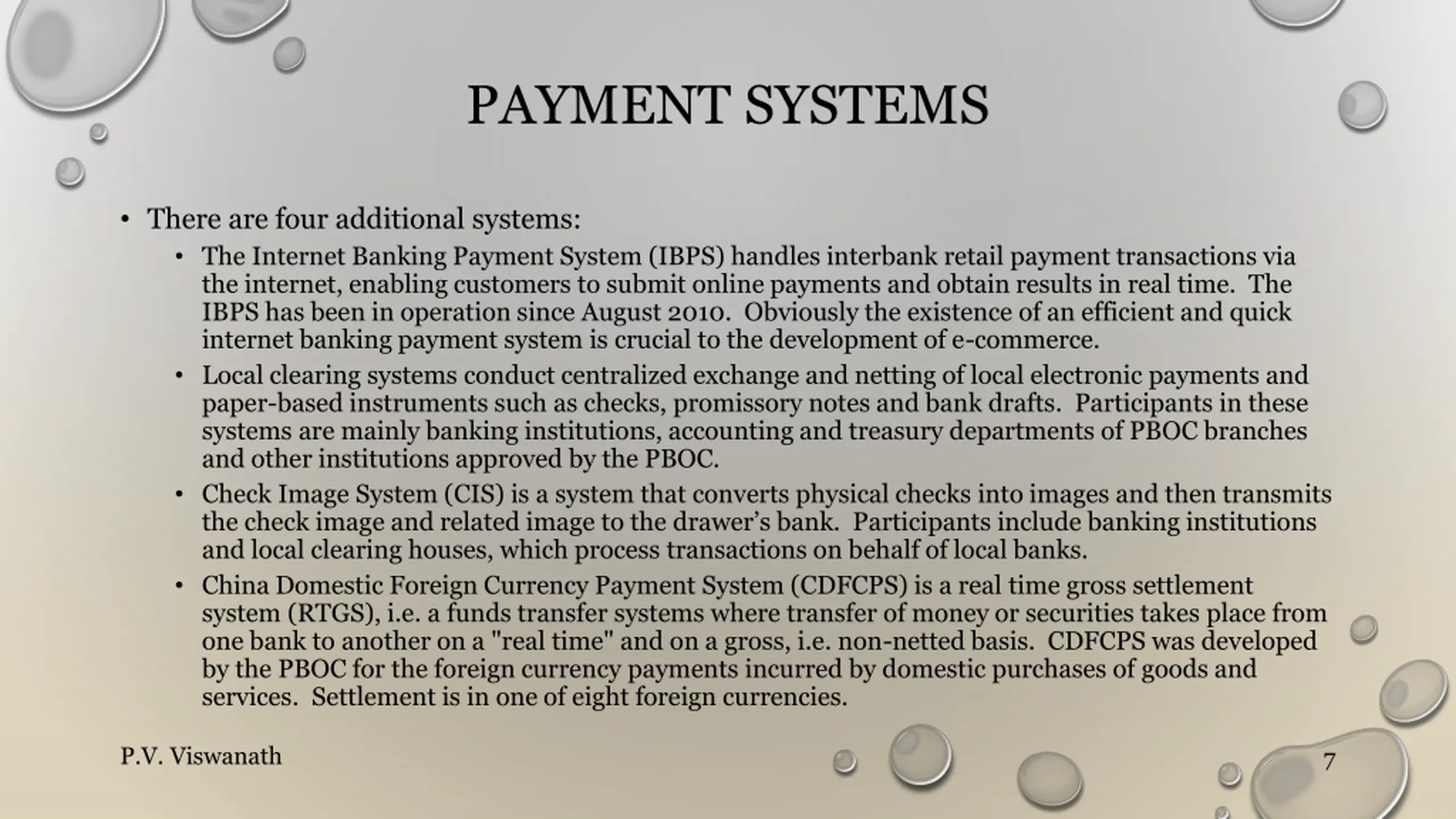PAYMENT SYSTEMS There are four additional systems: The Internet Banking Payment System (IBPS) handles interbank retail payment transactions via the internet, enabling customers to submit online payments and obtain results in real time. The IBPS has been in operation since August 2010. Obviously the existence of an efficient and quick internet banking payment system is crucial to the development of e-commerce. Local clearing systems conduct centralized exchange and netting of local electronic payments and paper-based instruments such as checks, promissory notes and bank drafts. Participants in these systems are mainly banking institutions, accounting and treasury departments of PBOC branches and other institutions approved by the PBOC. Check Image System (CIS) is a system that converts physical checks into images and then transmits the check image and related image to the drawer s bank. Participants include banking institutions and local clearing houses, which process transactions on behalf of local banks. China Domestic Foreign Currency Payment System (CDFCPS) is a real time gross settlement system (RTGS), i.e. a funds transfer systems where transfer of money or securities takes place from one bank to another on a "real time" and on a gross, i.e. non-netted basis. CDFCPS was developed by the PBOC for the foreign currency payments incurred by domestic purchases of goods and services. Settlement is in one of eight foreign currencies. P.V. Viswanath 7