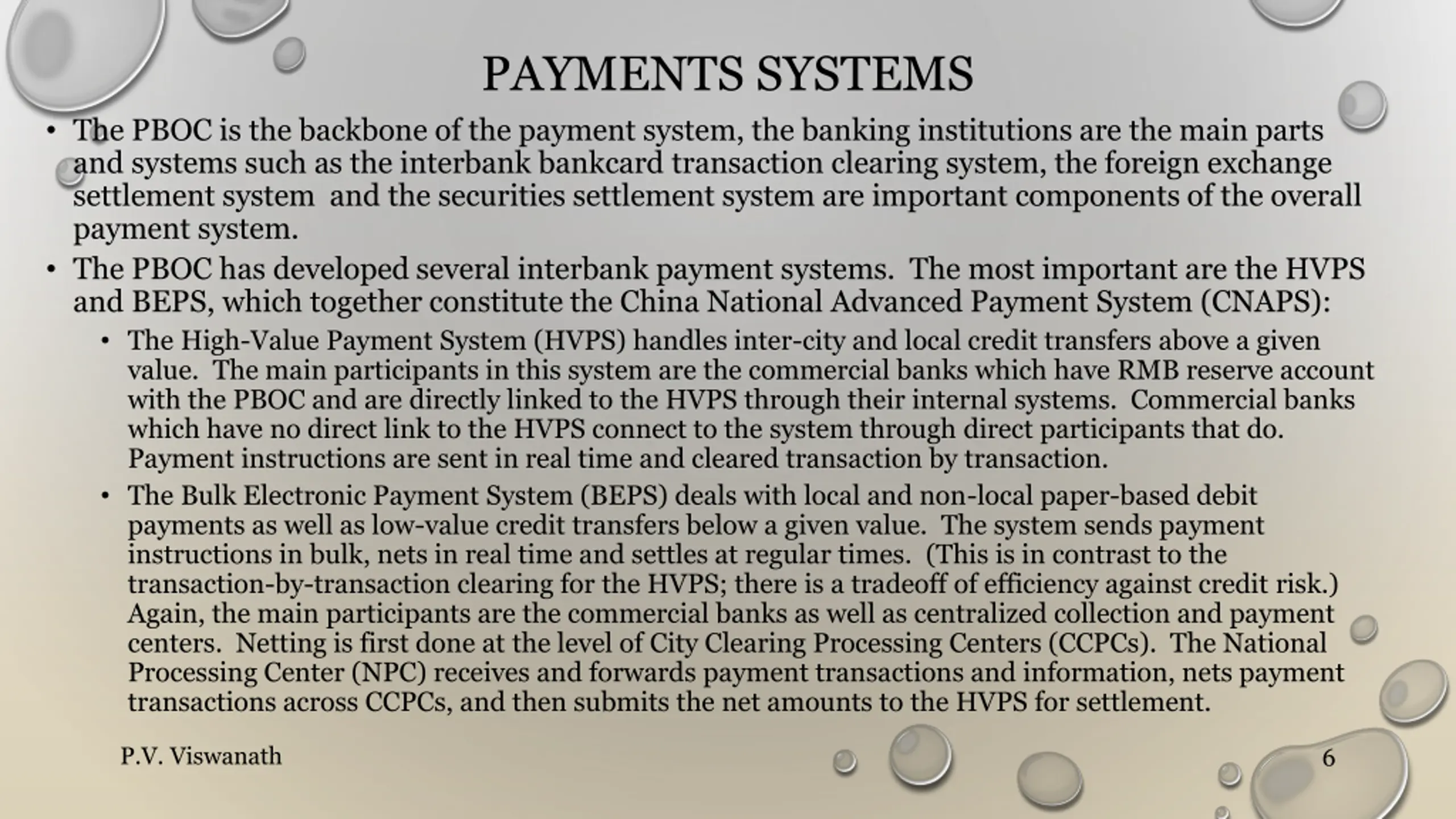 PAYMENTS SYSTEMS The PBOC is the backbone of the payment system, the banking institutions are the main parts and systems such as the interbank bankcard transaction clearing system, the foreign exchange settlement system and the securities settlement system are important components of the overall payment system. The PBOC has developed several interbank payment systems. The most important are the HVPS and BEPS, which together constitute the China National Advanced Payment System (CNAPS): The High-Value Payment System (HVPS) handles inter-city and local credit transfers above a given value. The main participants in this system are the commercial banks which have RMB reserve account with the PBOC and are directly linked to the HVPS through their internal systems. Commercial banks which have no direct link to the HVPS connect to the system through direct participants that do. Payment instructions are sent in real time and cleared transaction by transaction. The Bulk Electronic Payment System (BEPS) deals with local and non-local paper-based debit payments as well as low-value credit transfers below a given value. The system sends payment instructions in bulk, nets in real time and settles at regular times. (This is in contrast to the transaction-by-transaction clearing for the HVPS; there is a tradeoff of efficiency against credit risk.) Again, the main participants are the commercial banks as well as centralized collection and payment centers. Netting is first done at the level of City Clearing Processing Centers (CCPCs). The National Processing Center (NPC) receives and forwards payment transactions and information, nets payment transactions across CCPCs, and then submits the net amounts to the HVPS for settlement. P.V. Viswanath 6