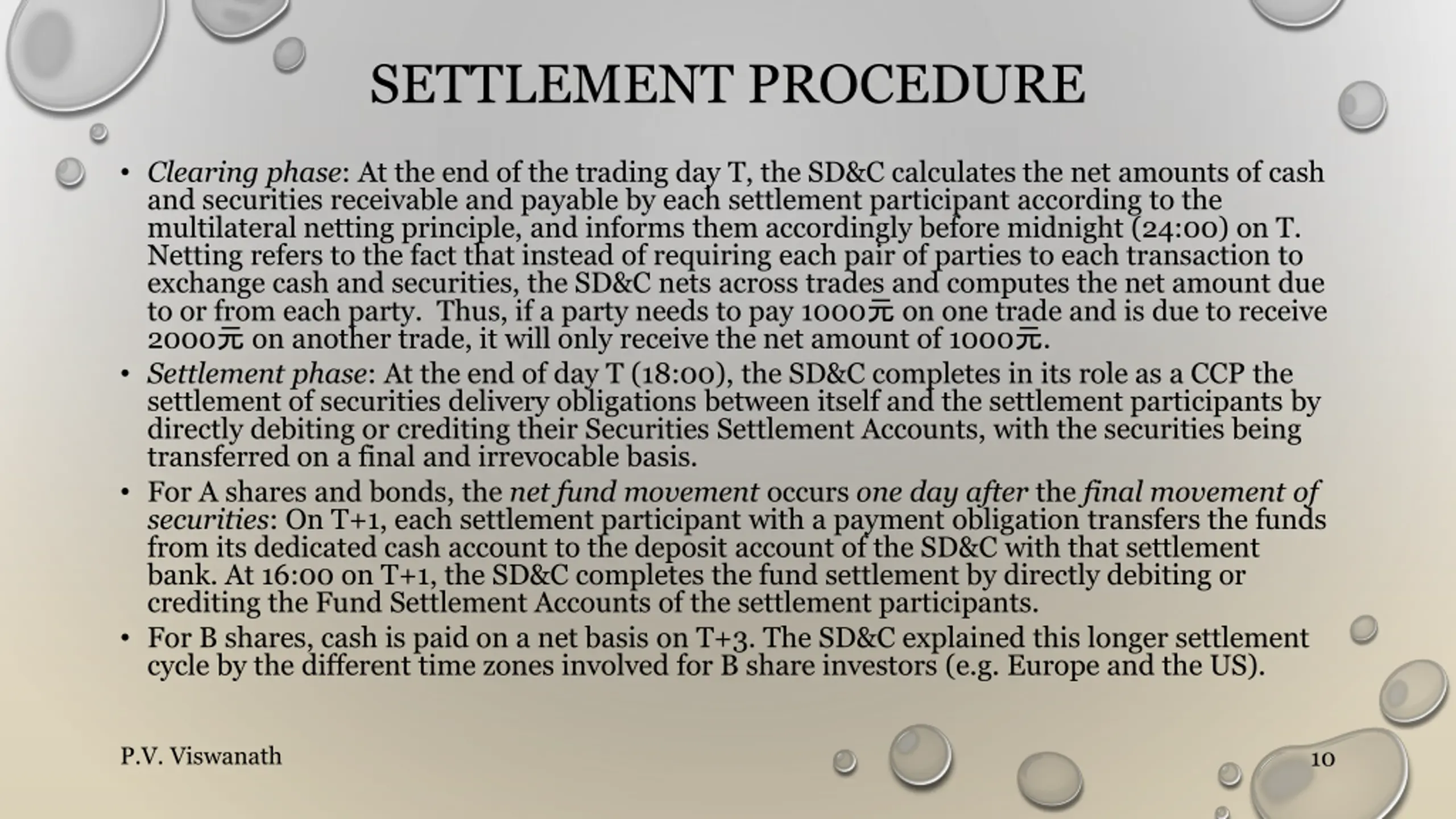 SETTLEMENT PROCEDURE Clearing phase: At the end of the trading day T, the SD&C calculates the net amounts of cash and securities receivable and payable by each settlement participant according to the multilateral netting principle, and informs them accordingly before midnight (24:00) on T. Netting refers to the fact that instead of requiring each pair of parties to each transaction to exchange cash and securities, the SD&C nets across trades and computes the net amount due to or from each party. Thus, if a party needs to pay 1000 on one trade and is due to receive 2000 on another trade, it will only receive the net amount of 1000 . Settlement phase: At the end of day T (18:00), the SD&C completes in its role as a CCP the settlement of securities delivery obligations between itself and the settlement participants by directly debiting or crediting their Securities Settlement Accounts, with the securities being transferred on a final and irrevocable basis. For A shares and bonds, the net fund movement occurs one day after the final movement of securities: On T+1, each settlement participant with a payment obligation transfers the funds from its dedicated cash account to the deposit account of the SD&C with that settlement bank. At 16:00 on T+1, the SD&C completes the fund settlement by directly debiting or crediting the Fund Settlement Accounts of the settlement participants. For B shares, cash is paid on a net basis on T+3. The SD&C explained this longer settlement cycle by the different time zones involved for B share investors (e.g. Europe and the US). P.V. Viswanath 10
