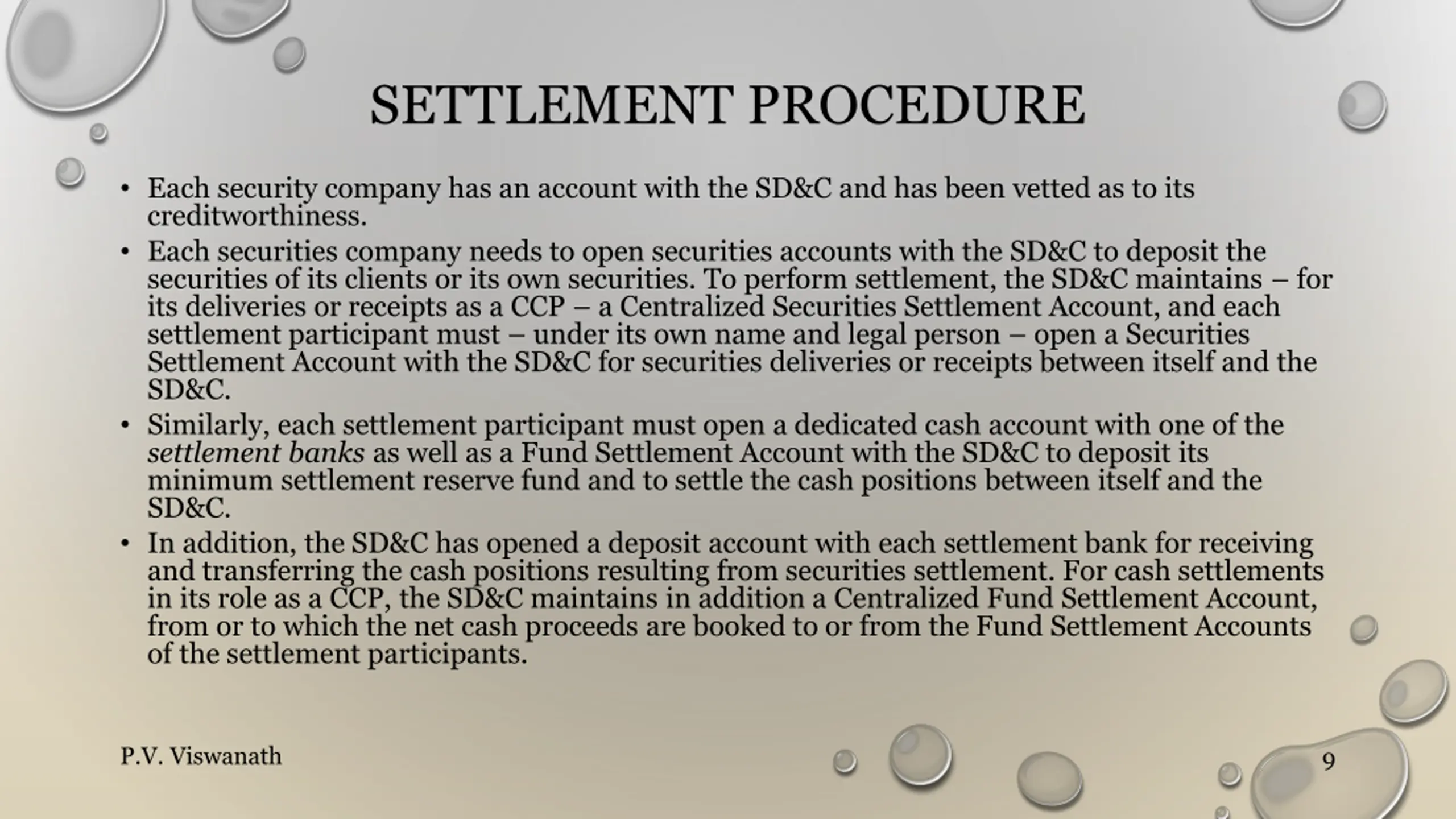 SETTLEMENT PROCEDURE Each security company has an account with the SD&C and has been vetted as to its creditworthiness. Each securities company needs to open securities accounts with the SD&C to deposit the securities of its clients or its own securities. To perform settlement, the SD&C maintains for its deliveries or receipts as a CCP a Centralized Securities Settlement Account, and each settlement participant must under its own name and legal person open a Securities Settlement Account with the SD&C for securities deliveries or receipts between itself and the SD&C. Similarly, each settlement participant must open a dedicated cash account with one of the settlement banks as well as a Fund Settlement Account with the SD&C to deposit its minimum settlement reserve fund and to settle the cash positions between itself and the SD&C. In addition, the SD&C has opened a deposit account with each settlement bank for receiving and transferring the cash positions resulting from securities settlement. For cash settlements in its role as a CCP, the SD&C maintains in addition a Centralized Fund Settlement Account, from or to which the net cash proceeds are booked to or from the Fund Settlement Accounts of the settlement participants. P.V. Viswanath 9