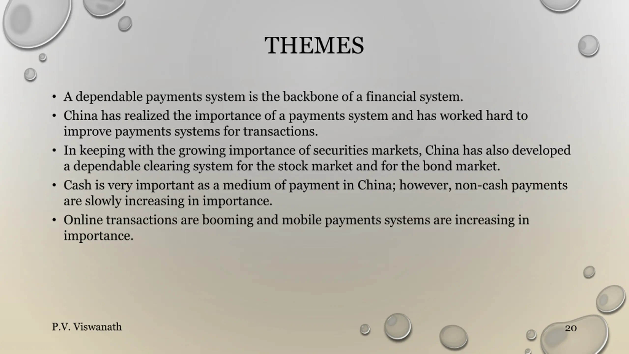 THEMES A dependable payments system is the backbone of a financial system. China has realized the importance of a payments system and has worked hard to improve payments systems for transactions. In keeping with the growing importance of securities markets, China has also developed a dependable clearing system for the stock market and for the bond market. Cash is very important as a medium of payment in China; however, non-cash payments are slowly increasing in importance. Online transactions are booming and mobile payments systems are increasing in importance. P.V. Viswanath 20