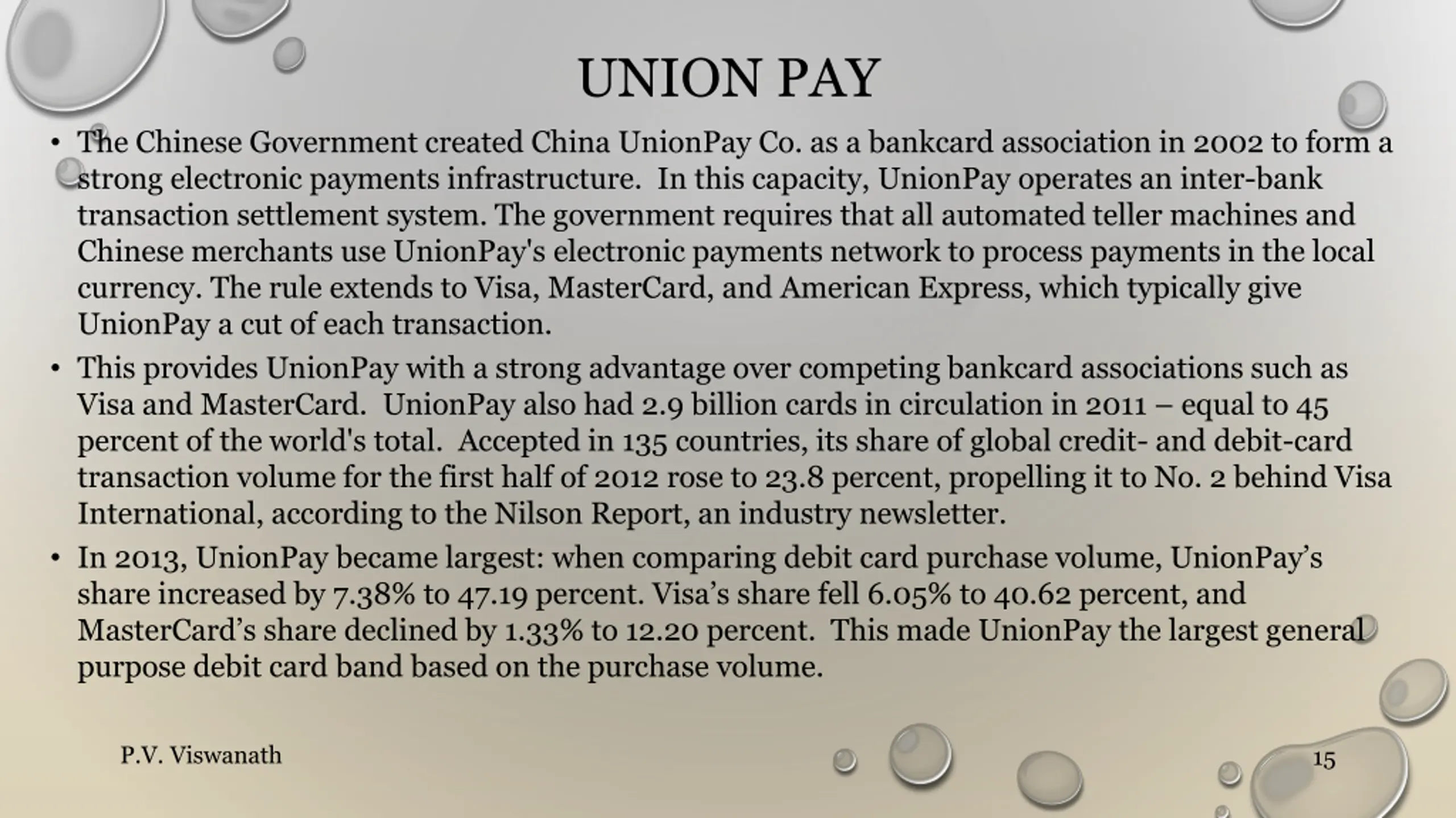 UNION PAY The Chinese Government created China UnionPay Co. as a bankcard association in 2002 to form a strong electronic payments infrastructure. In this capacity, UnionPay operates an inter-bank transaction settlement system. The government requires that all automated teller machines and Chinese merchants use UnionPay's electronic payments network to process payments in the local currency. The rule extends to Visa, MasterCard, and American Express, which typically give UnionPay a cut of each transaction. This provides UnionPay with a strong advantage over competing bankcard associations such as Visa and MasterCard. UnionPay also had 2.9 billion cards in circulation in 2011 equal to 45 percent of the world's total. Accepted in 135 countries, its share of global credit- and debit-card transaction volume for the first half of 2012 rose to 23.8 percent, propelling it to No. 2 behind Visa International, according to the Nilson Report, an industry newsletter. In 2013, UnionPay became largest: when comparing debit card purchase volume, UnionPay s share increased by 7.38% to 47.19 percent. Visa s share fell 6.05% to 40.62 percent, and MasterCard s share declined by 1.33% to 12.20 percent. This made UnionPay the largest general purpose debit card band based on the purchase volume. P.V. Viswanath 15