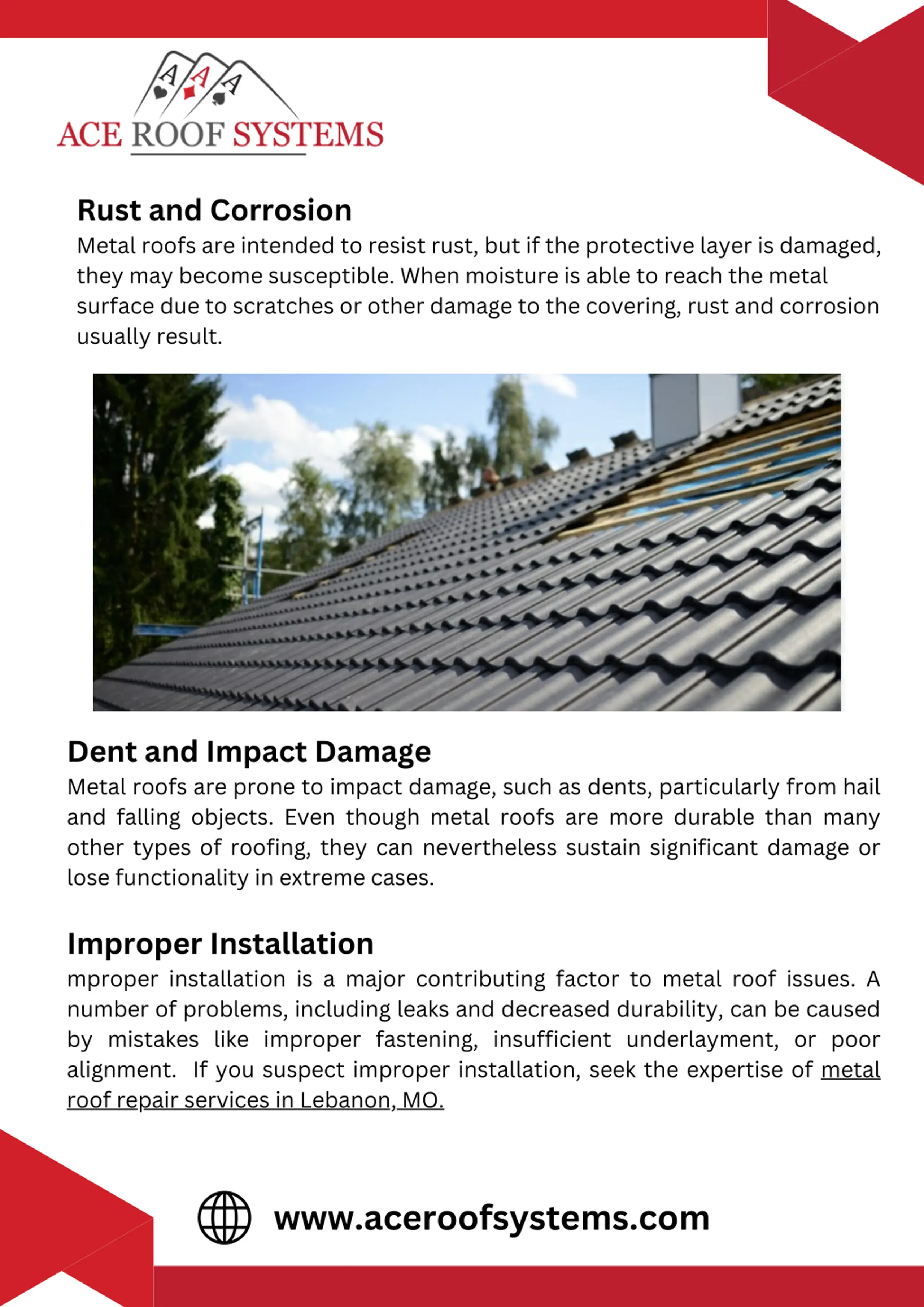 Rust and Corrosion Metal roofs are intended to resist rust, but if the protective layer is damaged, they may become susceptible. When moisture is able to reach the metal surface due to scratches or other damage to the covering, rust and corrosion usually result. Dent and Impact Damage Metal roofs are prone to impact damage, such as dents, particularly from hail and falling objects. Even though metal roofs are more durable than many other types of roofing, they can nevertheless sustain significant damage or lose functionality in extreme cases. Improper Installation mproper installation is a major contributing factor to metal roof issues. A number of problems, including leaks and decreased durability, can be caused by mistakes like improper fastening, insufficient underlayment, or poor alignment. If you suspect improper installation, seek the expertise of metal roof repair services in Lebanon, MO. www.aceroofsystems.com