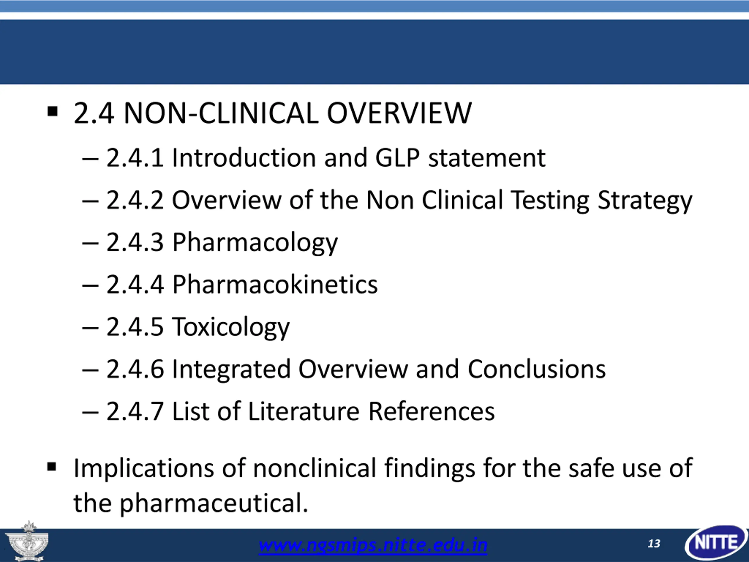 2.4 NON-CLINICAL OVERVIEW 2.4.1 Introduction and GLP statement 2.4.2 Overview of the Non Clinical Testing Strategy 2.4.3 Pharmacology 2.4.4 Pharmacokinetics 2.4.5 Toxicology 2.4.6 Integrated Overview and Conclusions 2.4.7 List of Literature References Implications of nonclinical findings for the safe use of the pharmaceutical. www.ngsmips.nitte.edu.in 13