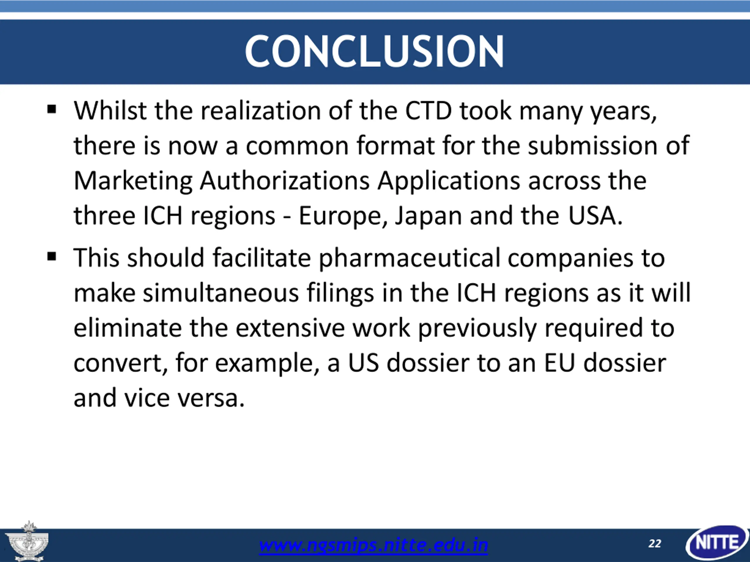 CONCLUSION Whilst the realization of the CTD took many years, there is now a common format for the submission of Marketing Authorizations Applications across the three ICH regions - Europe, Japan and the USA. This should facilitate pharmaceutical companies to make simultaneous filings in the ICH regions as it will eliminate the extensive work previously required to convert, for example, a US dossier to an EU dossier and vice versa. www.ngsmips.nitte.edu.in 22