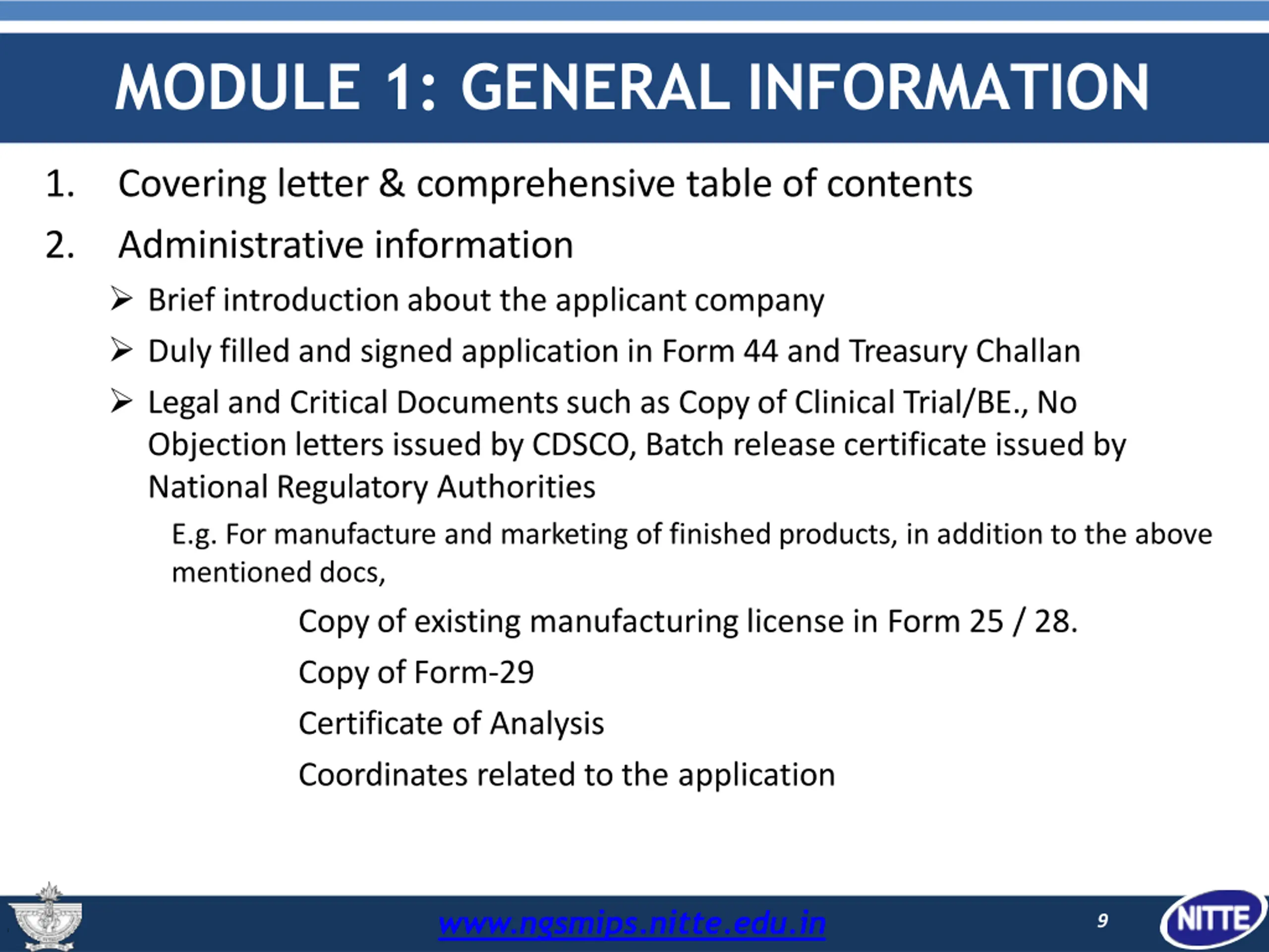 MODULE 1: GENERAL INFORMATION 1. 2. Covering letter & comprehensive table of contents Administrative information Brief introduction about the applicant company Duly filled and signed application in Form 44 and Treasury Challan Legal and Critical Documents such as Copy of Clinical Trial/BE., No Objection letters issued by CDSCO, Batch release certificate issued by National Regulatory Authorities E.g. For manufacture and marketing of finished products, in addition to the above mentioned docs, Copy of existing manufacturing license in Form 25 / 28. Copy ofForm-29 Certificate of Analysis Coordinates related to the application www.ngsmips.nitte.edu.in 9