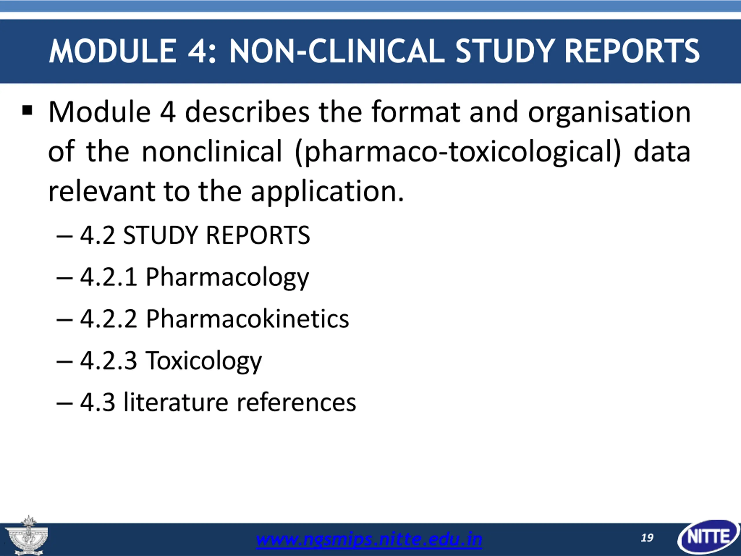 MODULE 4: NON-CLINICAL STUDY REPORTS Module 4 describes the format and organisation of the nonclinical (pharmaco-toxicological) data relevant to the application. 4.2 STUDY REPORTS 4.2.1 Pharmacology 4.2.2 Pharmacokinetics 4.2.3 Toxicology 4.3 literature references www.ngsmips.nitte.edu.in 19