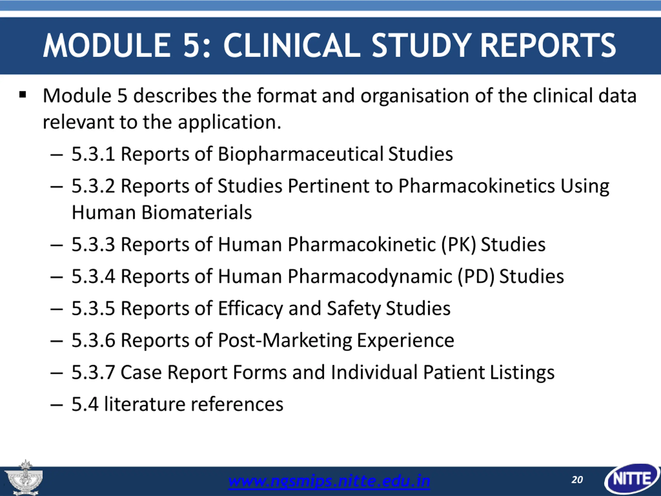 MODULE 5: CLINICAL STUDY REPORTS Module 5 describes the format and organisation of the clinical data relevant to the application. 5.3.1 Reports of BiopharmaceuticalStudies 5.3.2 Reports of Studies Pertinent to Pharmacokinetics Using Human Biomaterials 5.3.3 Reports of Human Pharmacokinetic (PK)Studies 5.3.4 Reports of Human Pharmacodynamic (PD)Studies 5.3.5 Reports of Efficacy and SafetyStudies 5.3.6 Reports of Post-MarketingExperience 5.3.7 Case Report Forms and Individual PatientListings 5.4 literaturereferences www.ngsmips.nitte.edu.in 20