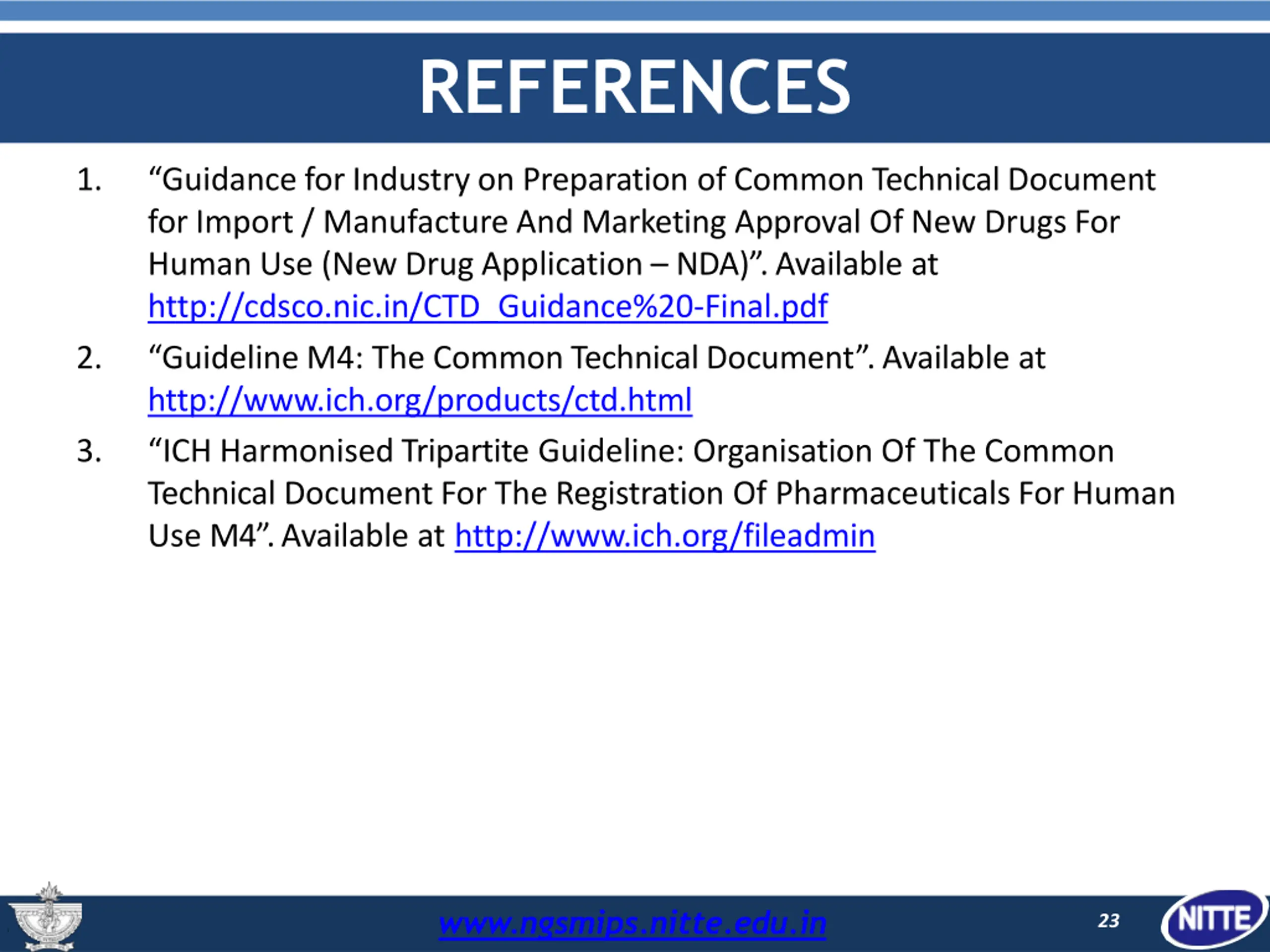 REFERENCES 1. Guidance for Industry on Preparation of Common Technical Document for Import / Manufacture And Marketing Approval Of New Drugs For Human Use (New Drug Application NDA) . Available at http://cdsco.nic.in/CTD_Guidance%20-Final.pdf Guideline M4: The Common Technical Document . Available at http://www.ich.org/products/ctd.html ICH Harmonised Tripartite Guideline: Organisation Of The Common Technical Document For The Registration Of Pharmaceuticals For Human Use M4 . Available at http://www.ich.org/fileadmin 2. 3. www.ngsmips.nitte.edu.in 23