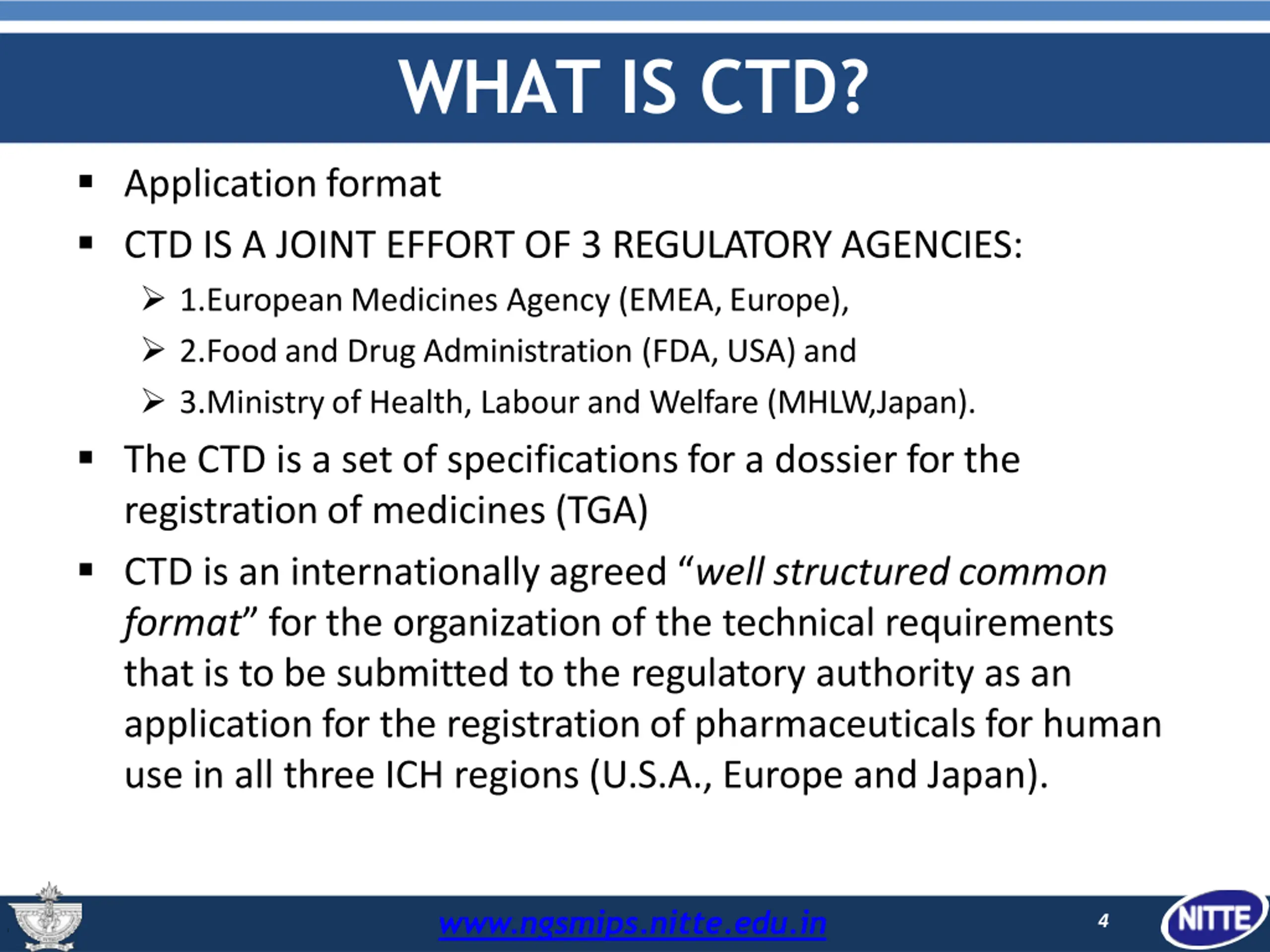 WHAT IS CTD? Applicationformat CTD IS A JOINT EFFORT OF 3 REGULATORYAGENCIES: 1.European Medicines Agency (EMEA,Europe), 2.Food and Drug Administration (FDA, USA)and 3.Ministry of Health, Labour and Welfare (MHLW,Japan). The CTD is a set of specifications for a dossier for the registration of medicines (TGA) CTD is an internationally agreed well structured common format for the organization of the technical requirements that is to be submitted to the regulatory authority as an application for the registration of pharmaceuticals for human use in all three ICH regions (U.S.A., Europe and Japan). www.ngsmips.nitte.edu.in 4