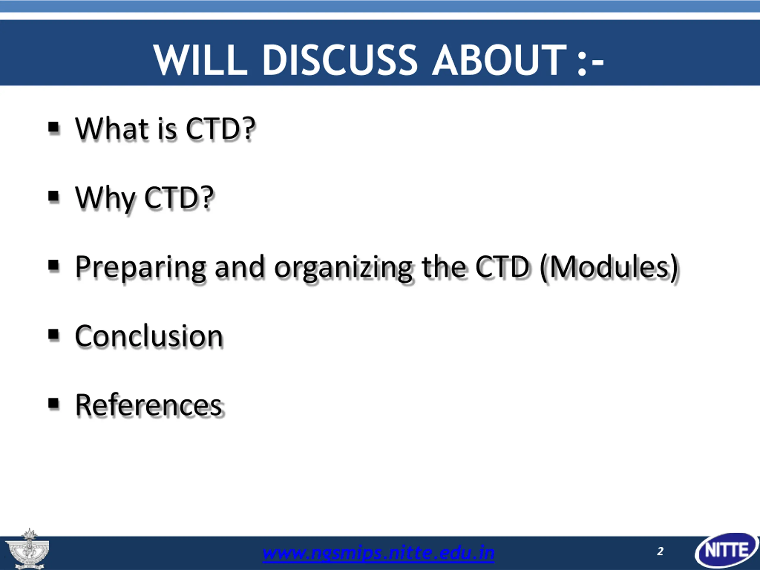 WILL DISCUSS ABOUT:- What is CTD? Why CTD? Preparing and organizing the CTD (Modules) Conclusion References www.ngsmips.nitte.edu.in 2
