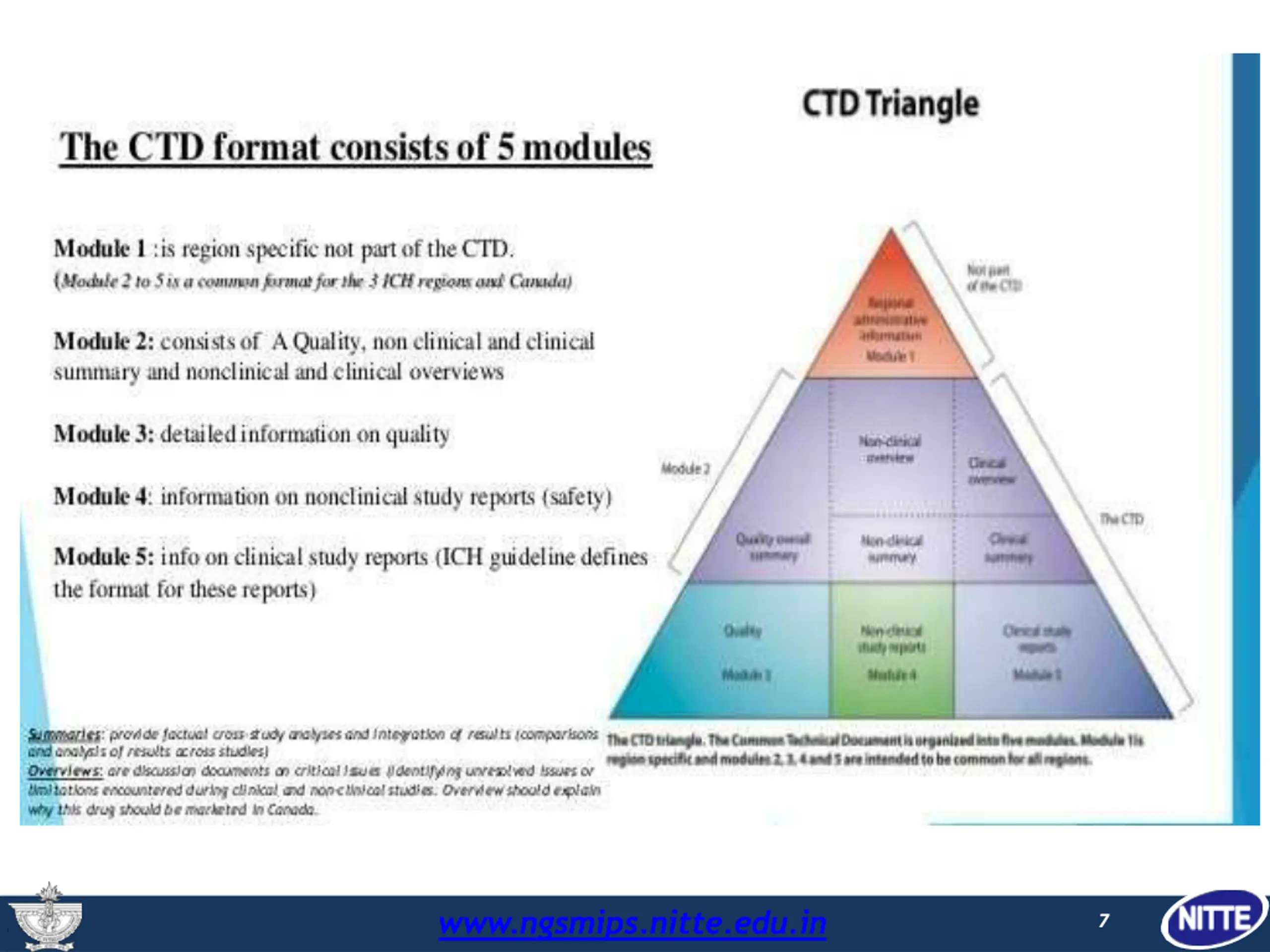 MODULES OF CTD It is organized into:- Module 1: General Information Module 2: CTD summaries Module 3: Quality Module 4: Nonclinical study reports Module 5: Clinical study reports www.ngsmips.nitte.edu.in 6