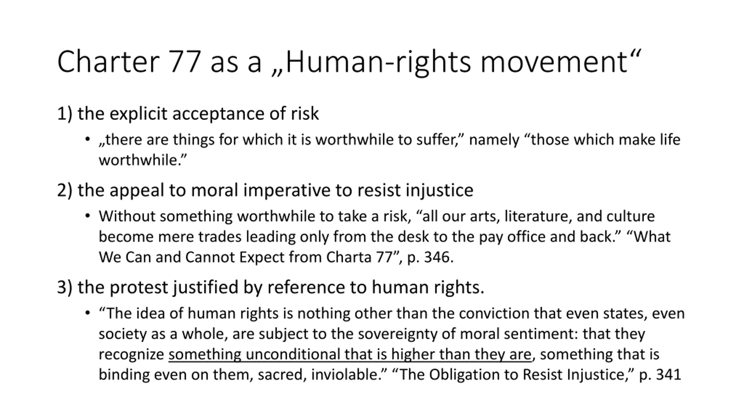 Charter 77 as a Human-rights movement 1) the explicit acceptance of risk there are things for which it is worthwhile to suffer, namely those which make life worthwhile. 2) the appeal to moral imperative to resist injustice Without something worthwhile to take a risk, all our arts, literature, and culture become mere trades leading only from the desk to the pay office and back. What We Can and Cannot Expect from Charta 77 , p. 346. 3) the protest justified by reference to human rights. The idea of human rights is nothing other than the conviction that even states, even society as a whole, are subject to the sovereignty of moral sentiment: that they recognize something unconditional that is higher than they are, something that is binding even on them, sacred, inviolable. The Obligation to Resist Injustice, p. 341