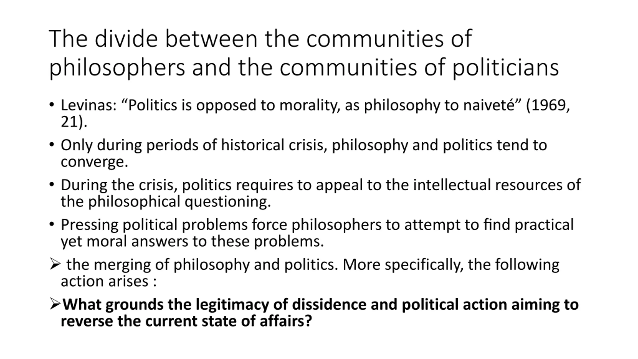 The divide between the communities of philosophers and the communities of politicians Levinas: Politics is opposed to morality, as philosophy to naivet (1969, 21). Only during periods of historical crisis, philosophy and politics tend to converge. During the crisis, politics requires to appeal to the intellectual resources of the philosophical questioning. Pressing political problems force philosophers to attempt to find practical yet moral answers to these problems. the merging of philosophy and politics. More specifically, the following action arises : What grounds the legitimacy of dissidence and political action aiming to reverse the current state of affairs?